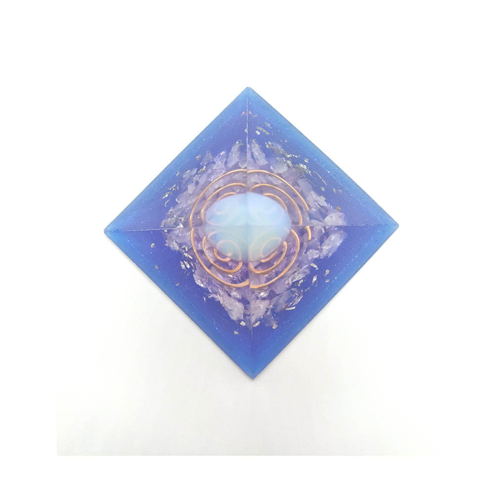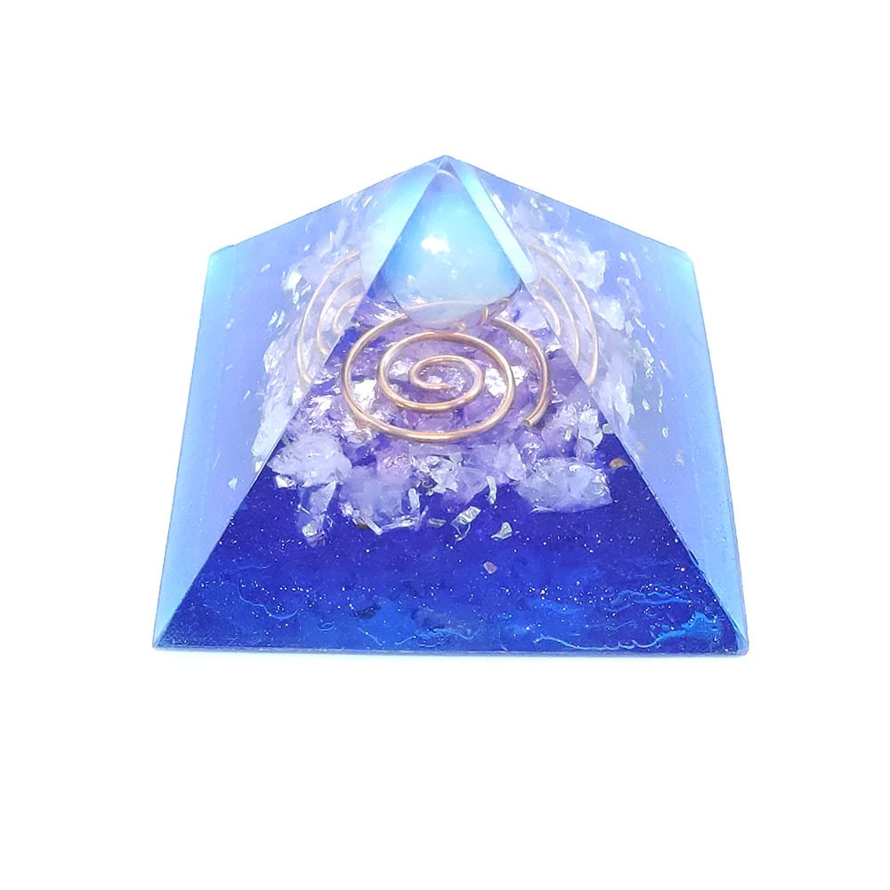 Orgonite Pirâmide Azul e Violeta com Pedra da Lua - Autoconhecimento Descrição: Ela tem uma forte ligação com a Lua, e com a intuição. Facilita “novos começos” e nos lembra que, assim como a Lua mingua e cresce, tudo faz parte de um ciclo de mudanças. Seu maior poder é de acalmar as emoções e reações exageradas à situações e à gatilhos emocionais. Equilibra o Yin e Yang. Traz para a consciência o que está no inconsciente, aflorando a intuição e a empatia. Estimula sonhos lúcidos. Intensifica e aumenta a clarividência. Outros benefícios: Exerce forte influência sobre as qualidades femininas, facilitando a menstruação e ajudando a equilibrar os incômodos físicos e psíquicos provocados pelas alterações hormonais, que ocorrem durante o ciclo menstrual. Aumenta a produção de leite em mulheres grávidas e previne tumores e doenças nas mamas, na pele e no baixo-ventre. Melhora a digestão, aumenta o metabolismo, fortalece a energia sexual e acelera o emagrecimento e a obtenção do peso ideal. Promove cura energética da pele, olhos, fígado e pâncreas e ajuda o corpo a eliminar toxinas. No Fengshui é aplicado na área do Conhecimento e Espiritualidade. Especificações: Sua finalidade básica é transformar energia negativa (íons positivos) em energia positiva (íons negativos) e harmonizar os ambientes. Proteção total contra energias eletromagnéticas, transmutação e equilíbrio emocional e atração de forças vitais curativas. A base de metal serve como uma antena para captar as energias ruins e transmutá-las, transformando-as em boas energias. A resina conforme vai secando, comprime os cristais, provocando um efeito chamado piezoelétrico que consiste na capacidade dos cristais gerarem um campo eletromagnético mediante pressão mecânica, neste caso provocada pela resina. Os cristais estão protegidos pela resina e irradiam íons negativos (ânions) de forma contínua. Além da energia dos orgonites não se esgotar, também não é necessário nenhum tipo de manutenção. Dados Técnicos: Dimensões: 7 x 7 x 6 cm (Comprimento x Largura x Altura). Peso: 160 gramas. **Obs: Produto fabricado artesanalmente, podendo haver variações**