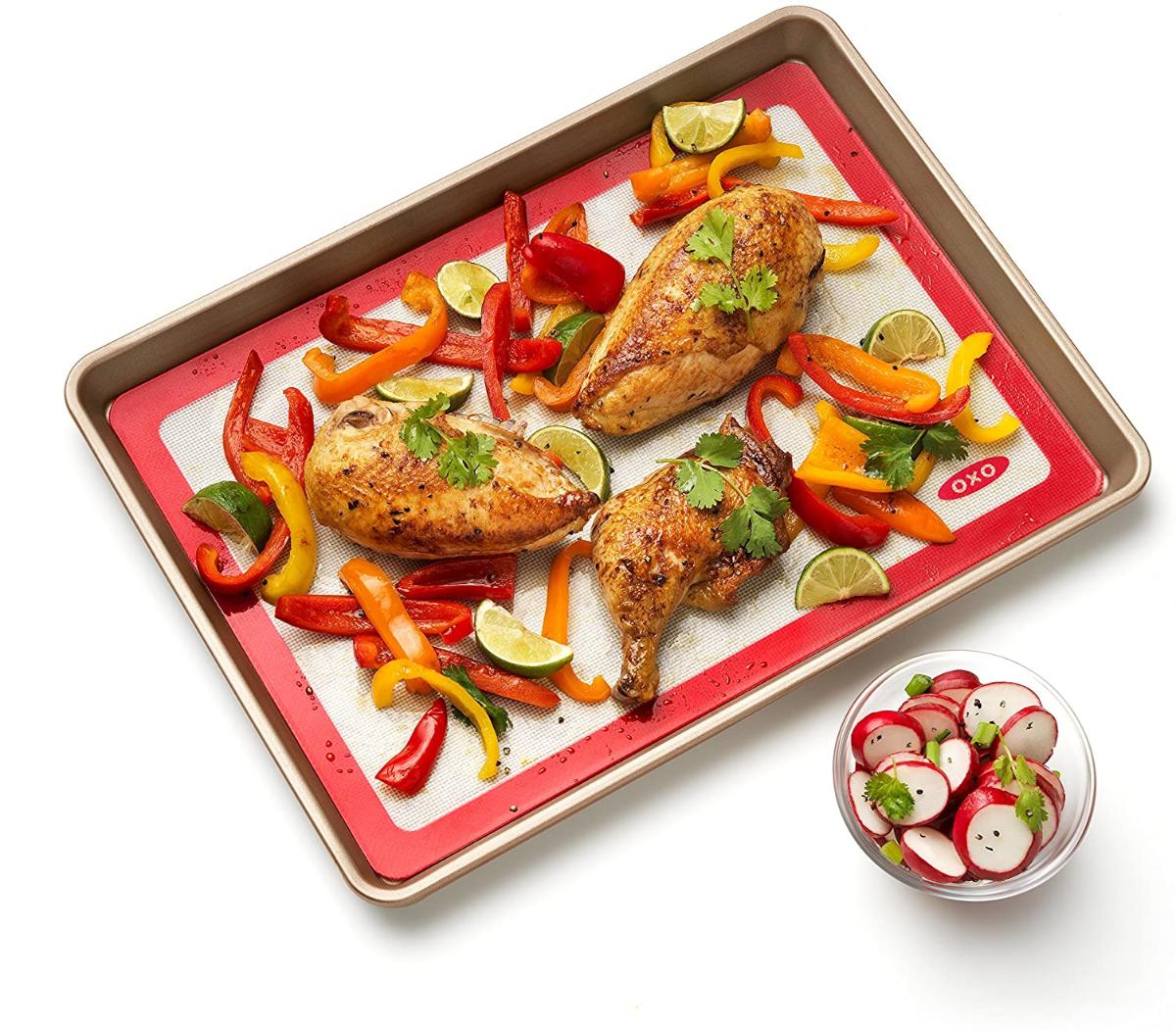 Se você está assando lotes de biscoitos de chocolate ou assando frango limão, você pode transformá-lo com o OXO Good Grips Silicone Baking Mat. Este tapete de silicone reutilizável e seguro para alimentos substitui pergaminho ou papel encerado e suporta facilmente massa, graxa e outros resíduos de cozimento. A construção de fibra de vidro e silicone proporciona estrutura e durabilidade e as dimensões de 11,5 polegadas x 16,5 polegadas o tornam perfeito para panelas de meia folha. Lava-louças seguras.