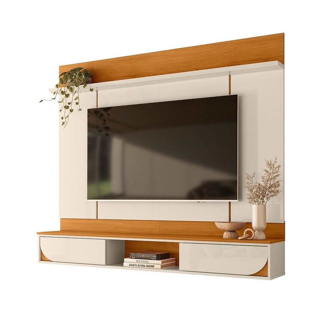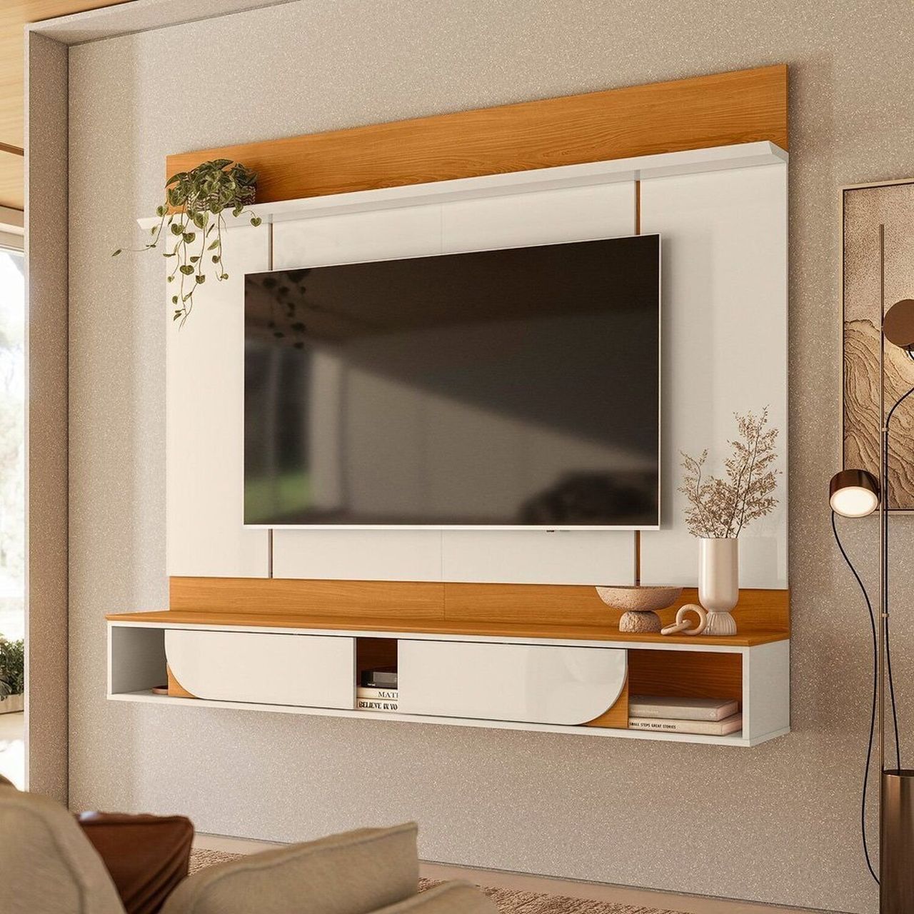 O Painel Aura é a escolha perfeita para quem busca um design minimalista e funcional. Desenvolvido para ser fixado na parede, ele permite a instalação do televisor diretamente sobre o painel, proporcionando um visual clean e bem organizado. As duas portas deslizantes com detalhes curvos e o painel com frisos verticais conferem um toque de sofisticação, enquanto a prateleira superior com borda chanfrada completa o conjunto com elegância. Com estrutura em mdp de 1,5 e 2,5cm, o Painel Aura oferece resistência e durabilidade. Suas dimensões são 182cm de largura, 156cm de altura e 31cm de profundidade, suportando TVs de até 65”. Ideal para compor salas de estar modernas, com equilíbrio entre estilo e praticidade.
