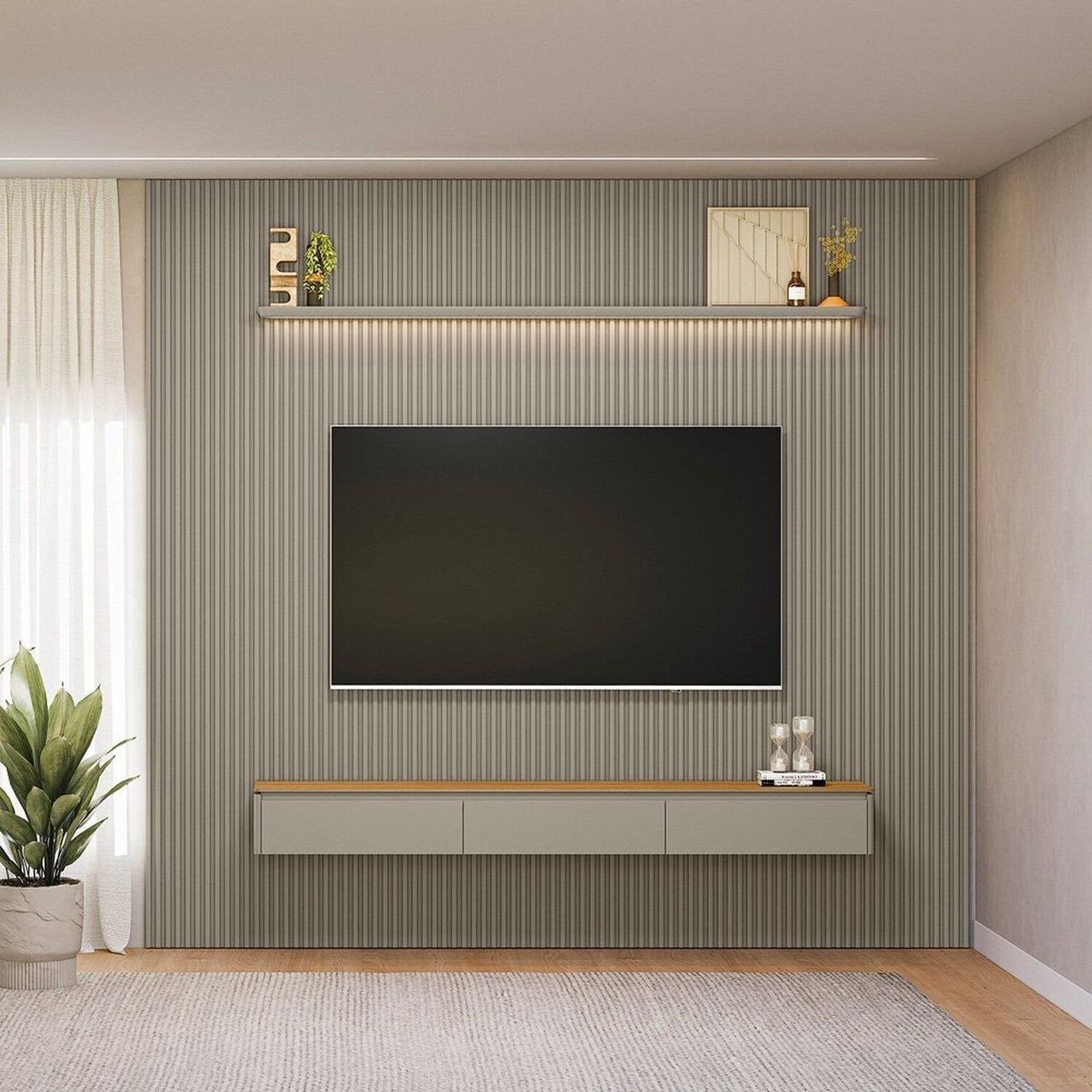 O Painel Ripado Modular É Perfeito Para Deixar Seu Ambiente Elegânte E Moderno.o Conjunto Possui Uma Prateleira Com Cantos