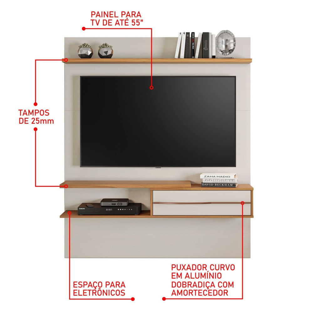 Compacto e com um belíssimo design! Esse é o Painel NT 1155 da Notável Móveis. Para utilizar na sala, no quarto ou na área de festas, tem capacidade para TV até 55, possui puxador curvado em alumínio e a dobradiça da porta é com amortecedor, que suaviza o fechamento. O móvel certo para quem busca estilo e um bom aproveitamento de espaço! Características: Material MDP de 15 e 25mm Pintura UV 1 Porta Puxador de alumínio Nicho Ideal para TV até 55 polegadas Dimensões: Altura: 160,2 cm Largura: 135 cm Profundidade: 29,2 cm Peso: 34,56 kg Garantia do fornecedor de 3 meses. Recomendações do fabricante: Para maior durabilidade, recomenda-se que a limpeza dos móveis seja feita da seguinte forma: Nas partes externas (portas, laterais e frente de gaveta) e internas, a limpeza deverá ser feita com pano limpo e levemente umedecido em água e sabão neutro. Em seguida, deverá ser passado um pano limpo e seco.