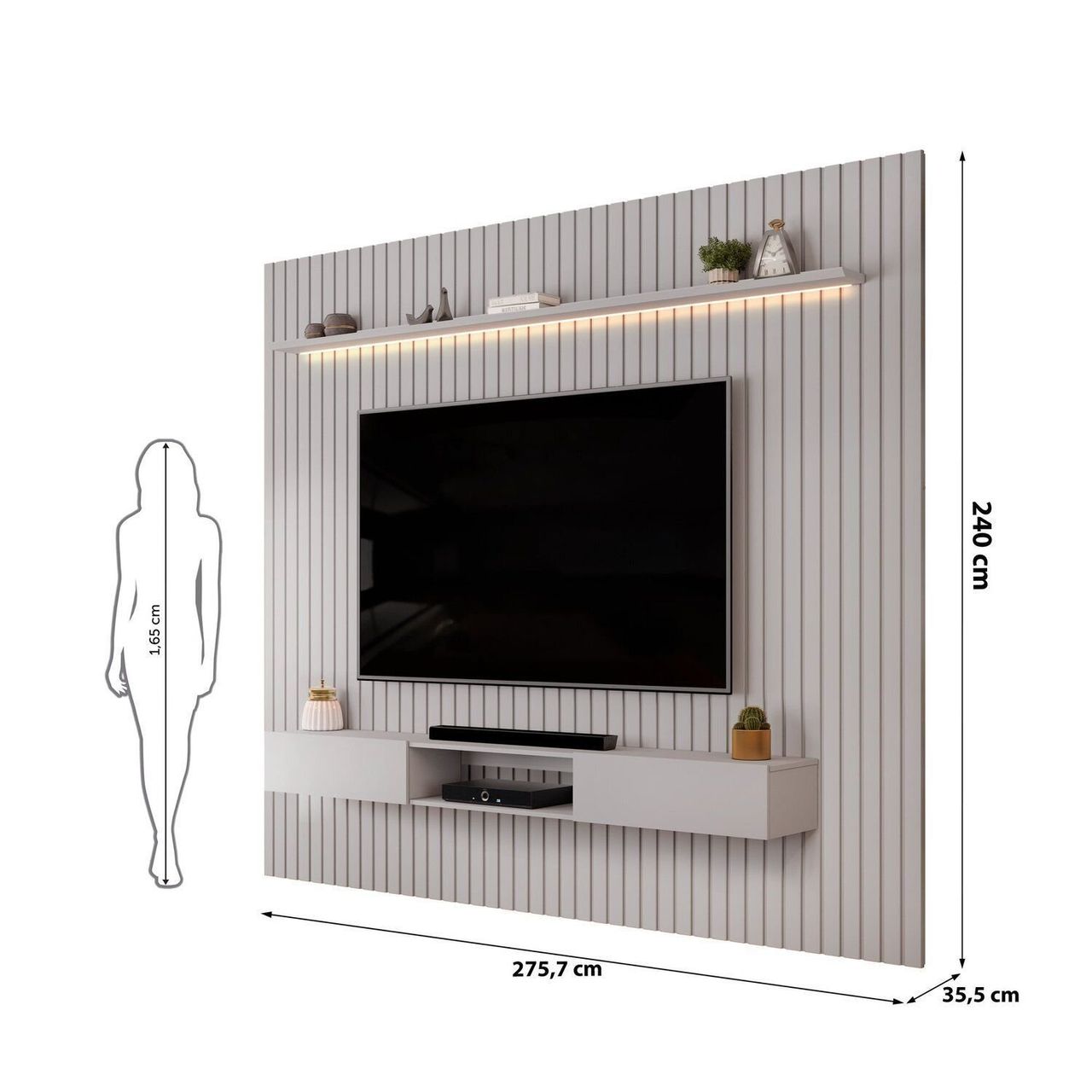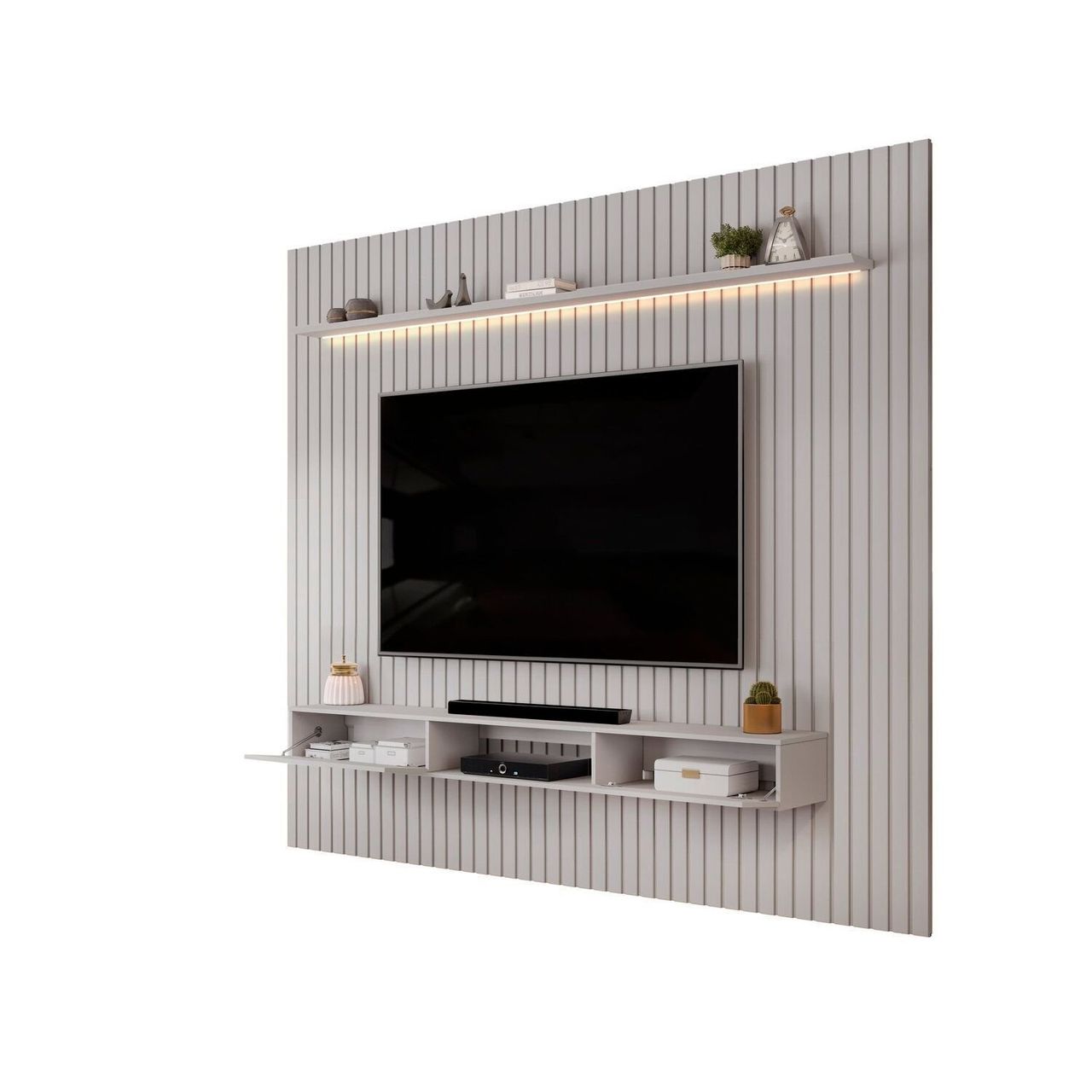 Além disso, o Painel Ripado Trento conta com uma ampla prateleira de 25cm de espessura e com borda chanfrada, onde você pode manter objetos decorativos em posição de destaque. O produto conta com iluminação LED horizontal na prateleira, equipado com lente difusora que proporciona uma iluminação suave e acolhedora.
