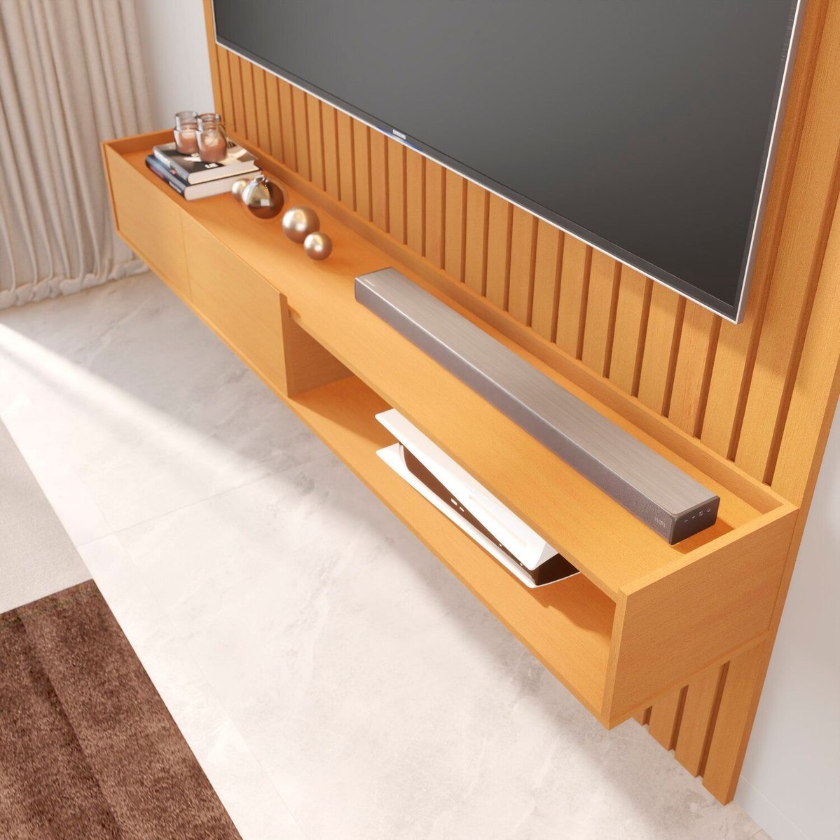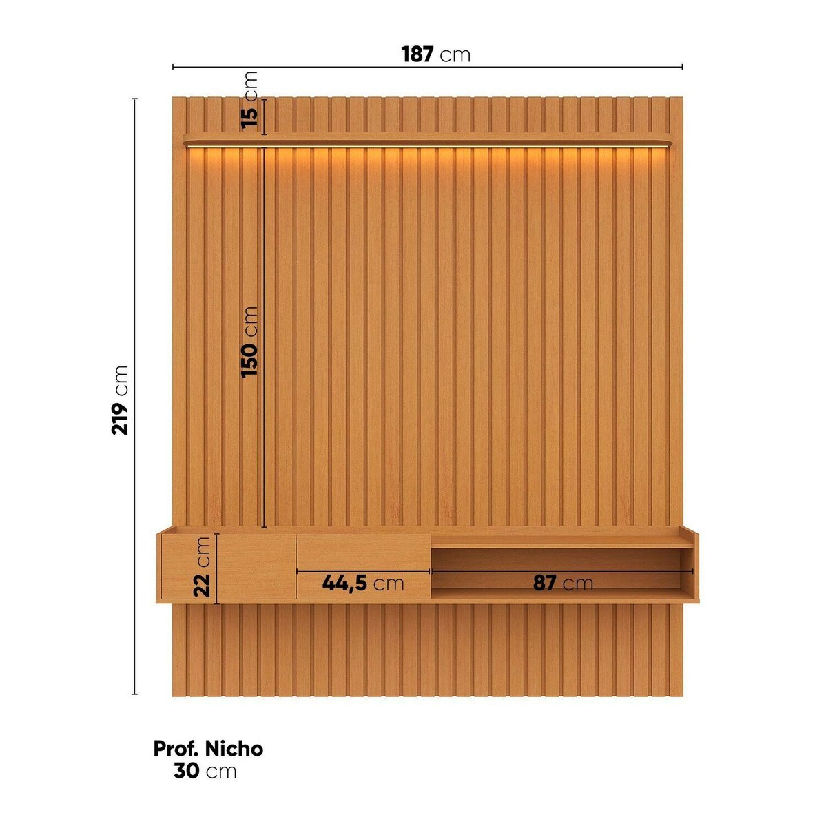O Painel Vitória Régia Ripado foi projetado para quem busca um móvel sofisticado, funcional e com presença marcante na sala de estar. Com dimensões amplas e design equilibrado, ele valoriza ambientes modernos e garante uma experiência completa de organização e estética. Possui largura de 187 cm e altura total de 219 cm, oferecendo um visual imponente e ideal para acomodar TVs de grandes polegadas. Seu design clean cria um fundo elegante para a TV, enquanto a iluminação superior adiciona aconchego e sofisticação ao ambiente, destacando o conjunto. O conjunto possui passa-fios, que facilitam a organização dos cabos e mantém o ambiente sempre limpo e organizado. Produzido 100% em MDF garantindo resistência e acabamento de alto padrão.