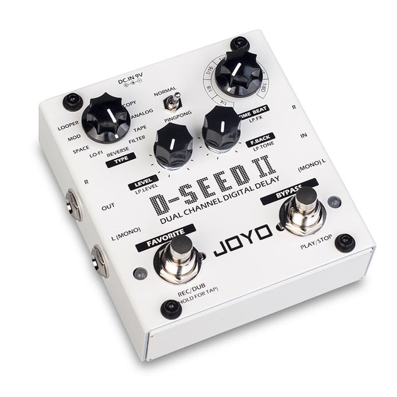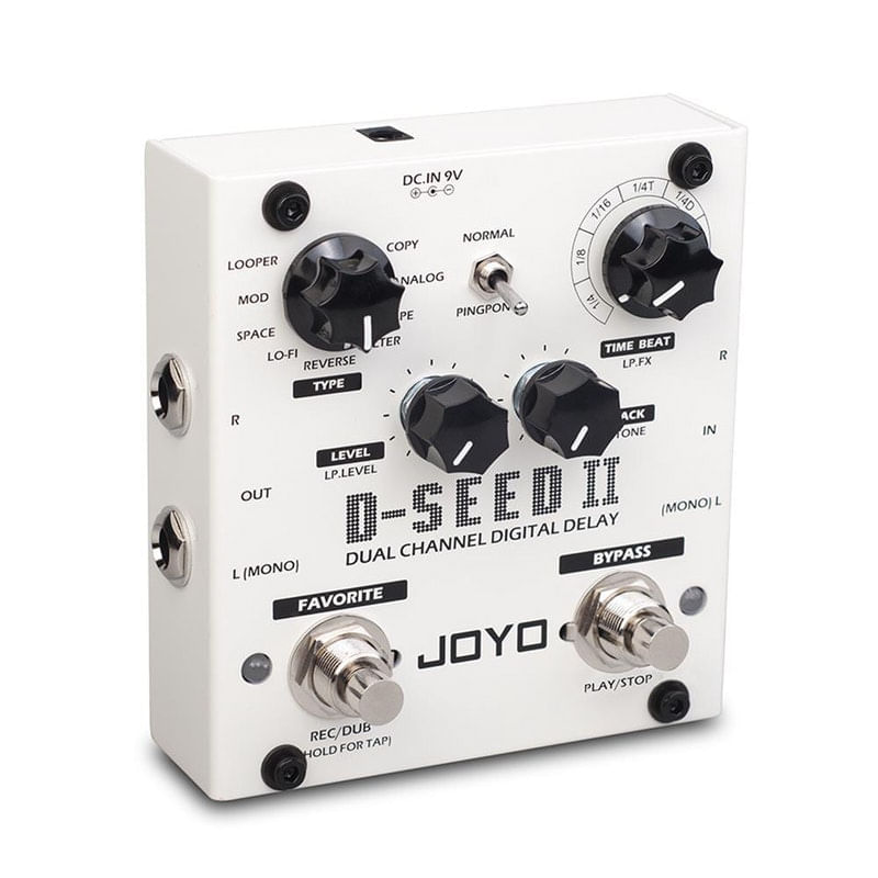 Pedal Joyo D-Seed 2 Dual Channel Digital Delay Stereo Com Looper. .Após o imenso sucesso da primeira geração do D-Seed, a Joyo Technology reuniu vários feedbacks de seus consumidores e lança, agora, o D-Seed II. Um Delay stereo, com novos algoritmos e 8 tipos de delay: Space, LO-FI, Filter, Tape, Copy, Analog, Modulation e Reverse. Entre as novas funcionalidades, o D-Seed II possui ainda a chave de acionamento para adicionar efeitos PingPong. O D-Seed 2 continua com a função Tap Tempo, e agora conta também com a função Looper, na qual você pode gravar até 3,5 minutos.. .Especificações:.Input e output stereo,.8 modos de delay com tempo máximo de 2000ms,.Controles: Type, Time beat ou Looper.FX, Level, F.Back ou Looper, Tone, PingPong toggle, Favorite ou Rec/Dub, Bypass ou Play/Stop,.Função Looper,.Função Tap Tempo,.Função Favorite - permite salvar as suas tonalidades favoritas.. .Imagens Meramente Ilustrativas. .Adquirimos e comercializamos somente produtos originais das importadoras oficiais das marcas..Garantia: 12 meses pelo Importador / Fornecedor..Medidas aproximadas do produto.- Comprimento: 16 cm.- Altura: 8 cm.- Largura: 14 cm.- Peso: 600 g marca:Joyo Entidade:Pedal para instrumentos marca:Joyo