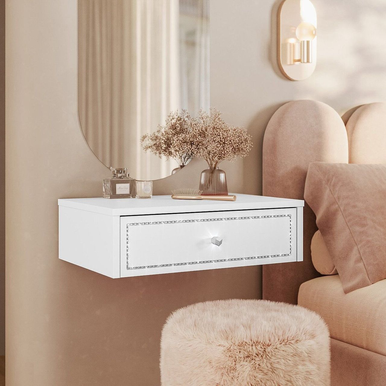 A Penteadeira Suspensa Strass É Um Produto Com Um Design Moderno, Inspirado No Estilo Italiano Com Um Toque Romântico E Sofisticado. Possui Um Detalhe Na Gaveta Com Um Friso Preenchido Com Uma Corrente De Pedras Em Strass Dando Um Brilho Intenso, O Puxador É Na Forma Hexagonal Refletindo O Seu Brilho Na Peça. Ela É Suspensa Na Parede E Bem Compacta Onde Você Poderá Colocar Ao Lado Da Cama Como Uma Mesa De Cabeceira, Economizando Espaço E Ampliando Seu Ambiente. Possui Uma Gaveta Com Corrediças Telescópicas E Nela Contém Uma Colmeia Para Você Rechear Com Maquiagens, Acessórios E Produtos Para Beleza. Este Produto Mostra Ao Mesmo Tempo Sofisticação, Delicadeza E Uma Elegância Luxuosa Para O Seu Ambiente.