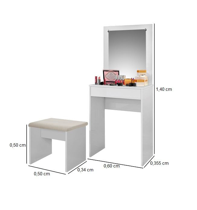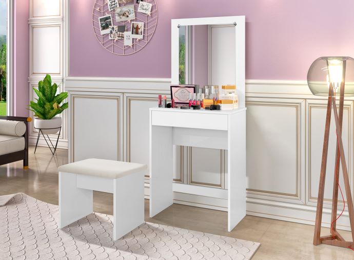 A Penteadeira Sofia É Ideal Para Você Que Quer Organizar Da Melhor Maneira Todos Os Seus Itens De Maquiagens E Similares, Sem Ocupar Muito Espaço, De Forma Prática E Eficiente. Penteadeira Fabricada Em Mdp, Possui 1 Gaveta, Espelho E Acabamento Em Pintura Uv E Verniz Brilho De Alta Qualidade. Banqueta Fabricada Em Mdf, Pintura Uv E Acabamento Verniz Brilho. Móvel Com Modelo De Penteadeira Simples Com Design Mais Clean.