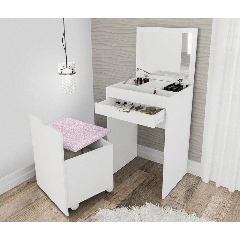Penteadeira Compacta com Espelho Branco/rosa - Tecno MobiliA Penteadeira PE2007 é de grande utilidade após usá-la basta fechar a tampa do espelho e encaixar o puff no espaço abaixo da gaveta, oferece espaços e divisórias para manter suas makes e bijuterias organizadas, possibilitando extrema facilidade e organização na hora de se embelezar. Tem uma beleza encantadora que dará um UP ao ambiente deixando o visual atraente e com muito estilo!Especificações Técnicas:- Marca: Tecno Mobili- Estrutura 100% MDP 15mm- Acabamento em BP e Tecido- Possui Espelho- Puff com Pés de Rodízios- Puxadores Cavados na Peça- Gaveta com Corrediças Metálicas- Tampa da Penteadeira c/ Pistão á gás e Dobradiças Metálicas- Volume: 02 unidades- Possui uma Tampa p/ Abertura c/ Dobradiças Metálicas e Pistão á Gás- Dimensões do Produto (LxAxP): Penteadeira: 54 X 85 x 45 cm- Dimensões do Produto (LxAxP): Puff: 50,4 X 65,1 x 39,9 cm- Peso total dos Produtos: 32,05Kg- Garantia: 3 mesesObservações importantes:- Acompanha manual e todos os acessórios para montagem- Recomendamos que a montagem seja feita por um profissional- As imagens são meramente ilustrativas e não acompanham objetos de decoração e eletros.- Pode haver alguma diferença de tonalidade entre a imagem e o produto, por conta do tratamento de imagens e a calibração de cores da sua tela.- Todos os nossos produtos são enviados devidamente embalados e com total segurança.- Ao receber o produto o cliente deve verificar as condições da embalagem, havendo alguma avaria não assine o comprovante de recebimento, entre em contato com a loja para orientações.- A nossa loja se responsabilizará pela entrega dos produtos adquiridos até a porta de entrada ou portaria do endereço indicado.- Não nos responsabilizamos, no ato da entrega, por montagens, desmontagens e instalações de produtos, bem como, por subir ou descer escadas/elevadores ou pela utilização de guinchos ou equipamentos similares para acesso a pisos superiores em apartamentos, casas ou escritórios. Estas despesas adicionais serão de responsabilidade do cliente.- Confira as dimensões do produto no momento da compra e certifique-se de que passará normalmente por elevadores, portas, escadas e/ou corredores, evitando assim futuros desagrados ou imprevistos com a entrega do produto.
