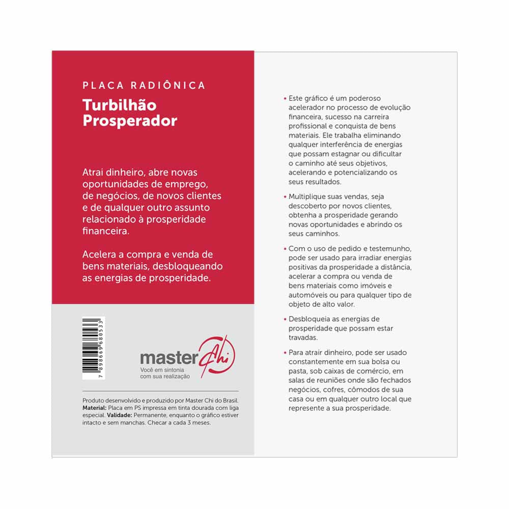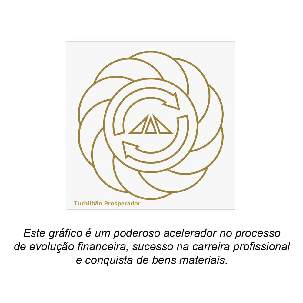 Placa Radiônica Turbilhão Prosperador Descrição: Este gráfico é um poderoso acelerador no processo de evolução financeira, sucesso na carreira profissional e conquista de bens materiais. Ele trabalha eliminando qualquer interferência de energias que possam estagnar ou dificultar o caminho até seus objetivos, acelerando e potencializando os seus resultados. Multiplique suas vendas, seja descoberto por novos clientes, obtenha a prosperidade gerando novas oportunidades e abrindo os seus caminhos. Com o uso de pedido e testemunho, pode ser usado para irradiar energias positivas da prosperidade a distância, acelerar a compra ou venda de bens materiais como imóveis e automóveis ou para qualquer tipo de objeto de alto valor. Desbloqueia as energias de prosperidade que possam estar travadas. Para atrair dinheiro, pode ser usado constantemente em sua bolsa ou pasta, sob caixas de comércio, em salas de reuniões onde são fechados negócios, cofres, cômodos de sua casa ou em qualquer outro local que represente a sua prosperidade. Especificações: Aplicações: Atrai dinheiro, abre novas oportunidades de emprego, de negócios, de novos clientes e de qualquer outro assunto relacionado à prosperidade financeira. Acelera a compra e venda de bens materiais, desbloqueando as energias de prosperidade. Use seu poder com Responsabilidade! Dados Técnicos: Dimensões: 14,0 x 14,0 (cm). Material: Placa em PS impressa em tinta dourada com liga especial. Duração: Validade permanente enquanto estiver intacto o gráfico e sem manchas na placa.