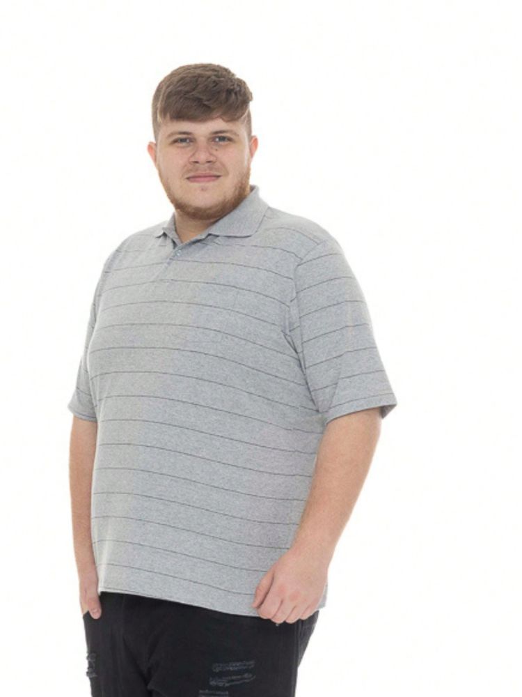 Plus Size Camisa Polo Listrada Cinza Mescla Com Bolso
