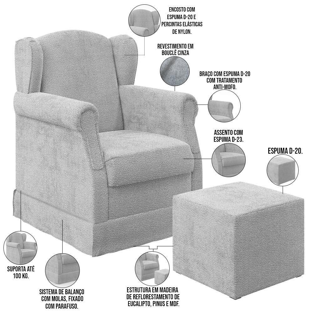 Poltrona De Amamentação Com Balanço E Puff Elisa P02 Bouclê Cinza - Lyam Decorum Dos Momentos Mais Importantes No Desenvolvimento Do Bebê É A Amamentação E Ter Um Ambiente Adequado Para Isso É Importantíssimo. Pensando Nisso A Poltrona De Amamentação Com Balanço E Puff Elisa P02 Bouclê Cinza - Lyam Decor Vem Para Superar Todas As Expectativas Quanto A Qualidade E Beleza, Ela Com Certeza Te Auxiliará Bastante Trazendo Muito Aconchego! Seu Balanço Proporciona Conforto E Tranquilidade Para O Ninar Dos Pequenos, Também O Puff Que É Um Ótimo Apoio Para Os Pés. É Produzida Com Materiais De Altíssima Qualidade Que Contam Com Imunização Contra Mofo E Cupim, Ela Ainda Conversa Muito Bem Com O Restante Da Sua Decoração Iluminando E Dando Mais Vida A Sua Casa. Não Perca Tempo E Aproveite!!dimensões Da Poltrona (l X A X P) 68 X 98 X 72 Cmmedidas Internas: Altura Do Encosto: 58 Cm Largura Do Assento: 49 Cm Profundidade Do Assento: 50 Cm Altura Dos Braços: 20 Cm Altura Do Chão Ao Assento: 45 Cmdimensões Do Puff (l X A X P) 38 X 33 X 38 Cmcaracterísticas: Estrutura Em Madeira De Reflorestamento De Eucalipto, Pinus E Mdf. Revestimento Em Bouclê Na Cor Cinza De Alta Qualidade. Assento Com Espuma D-23. Encosto Com Espuma D-20. Braço Com Espuma D-20 Com Tratamento Anti-mofo. Percinta Elástica De Nylon. Peso Suportado: Até 100 Kg. Sistema De Balanço Em Madeira Com Molas, Fixado Com Parafusos.- Nunca Sentar Nos Braços Ou Encosto Do Produto. - Por Se Tratar De Estofado As Medidas Podem Ter Uma Pequena Variação De Até 3 Cm. - A Tonalidade Do Produto Real Poderá Ter Ligeira Variação Devido O Lote De Tecidos. - Indicado Para Uso Residencial, Sua Limpeza Deve Ser Feita Com Pano Levemente Umedecido Em Água Limpa, Sem Esfregar, Não Utilizar Produtos Abrasivos, Desengordurantes, Álcool Ou Solvente.observações Importantes: - Produto Para Uso Residencial Em Ambiente Interno, Não Devendo Ficar Exposto Diretamente Ao Sol, Calor E Umidade Excessivos. - Pode Haver Alguma Diferença De Tonalidade Entre A Imagem E O Produto Real, Por Conta Do Tratamento De Imagens E A Calibração De Cores Do Seu Monitor. - As Imagens São Meramente Ilustrativas, Não Acompanham Objetos De Decoração E Eletrônicos. - Ao Receber A Mercadoria, O Cliente Deve Verificar As Condições Da Embalagem, Caso Haja Alguma Avaria Não Assine O Comprovante De Recebimento E Entre Em Contato Com Nossa Loja Para Orientações. - Montagem, Desmontagem E Outras Instalações Serão De Responsabilidade Do Cliente. Não Nos Responsabilizamos, No Ato Da Entrega, Por Subir Escadas/elevadores Ou Pelo Transporte Por Guincho Em Apartamentos. Eventuais Despesas São De Responsabilidade Do Comprador. - Confira As Dimensões Do Produto E Certifique-se De Que Passará Normalmente Por Supostos Elevadores, Portas, Escadas E/ou Corredores De Sua Residência. - Para Mais Informações, Acesse Nossa Central De Atendimento. Na