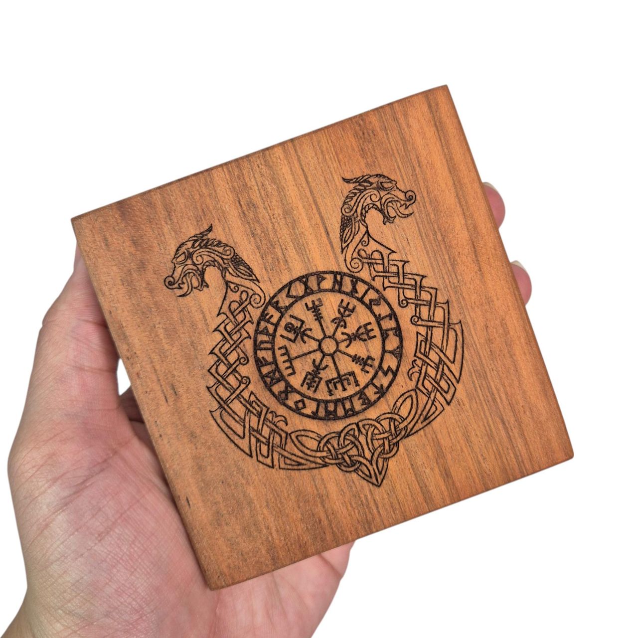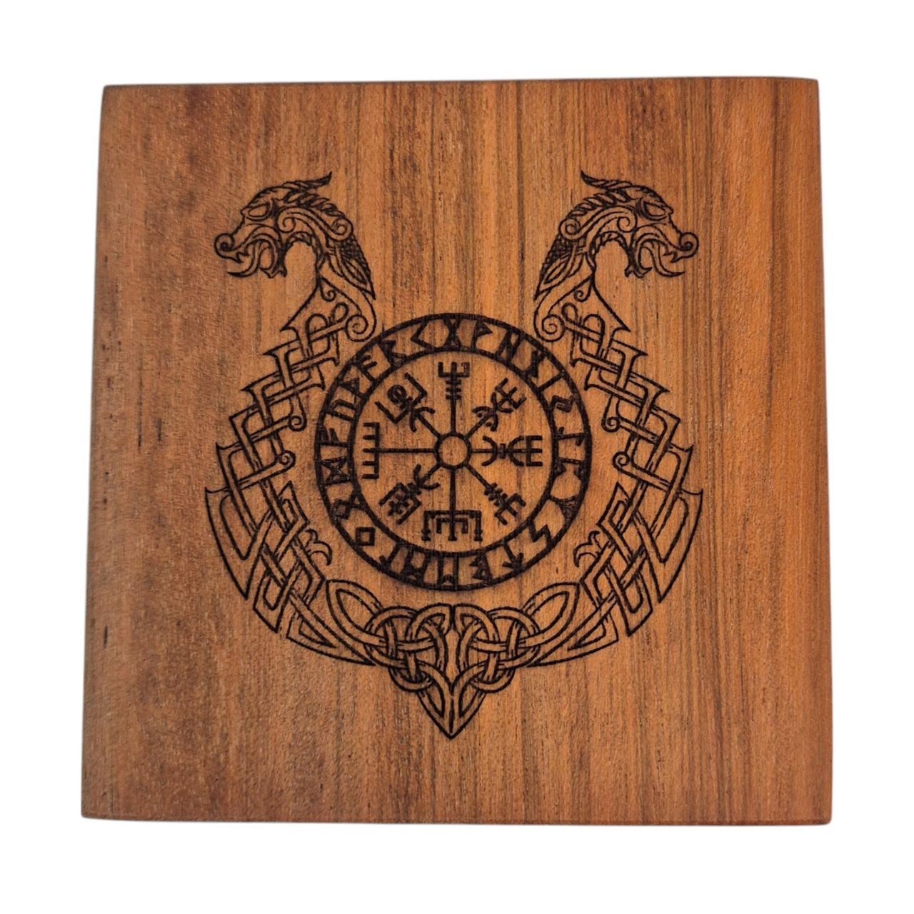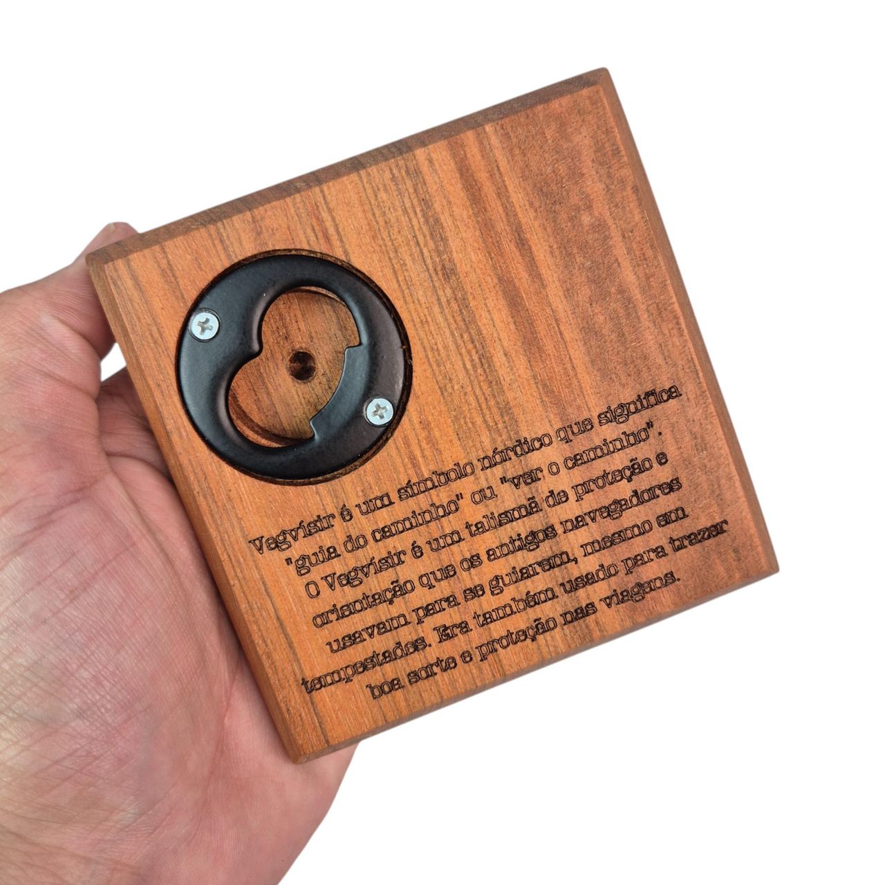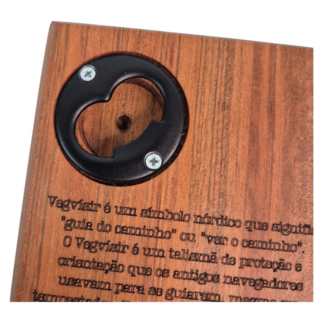 Porta Copos Viking Com Abridor E Símbolo Vegvisir Em Madeira. Este porta-copos une funcionalidade e simbolismo nórdico em uma peça única.