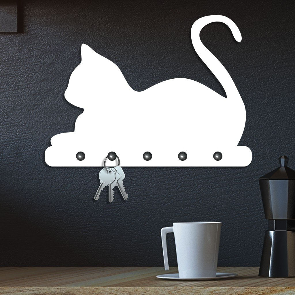Porta Chaves De Parede Gato Deitado Branco - características Gerais Do Produto: Dimensões: 25cm X 18cm Cor Da Peça: Preto / Branco Espessura: 6mm Material: Mdf Laminado Acompanha: Fita Dupla Face E Ganchos Em Metal garantia: 7 Dias