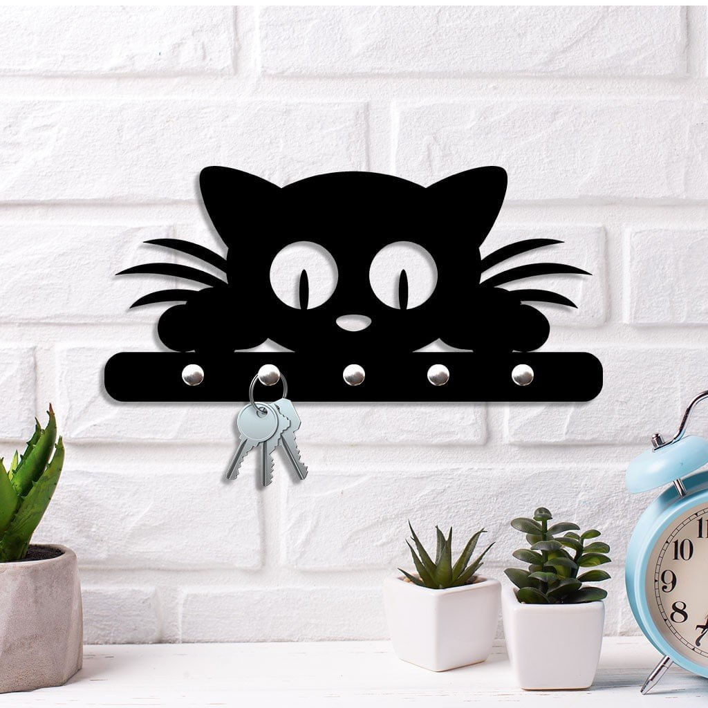 Porta Chaves De Parede Gato Espiando Preto - características Gerais Do Produto: Dimensões: 25cm X 12cm Cor Da Peça: Preto / Branco Espessura: 6mm Material: Mdf Laminado Acompanha: Fita Dupla Face E Ganchos Em Metal garantia: 7 Dias