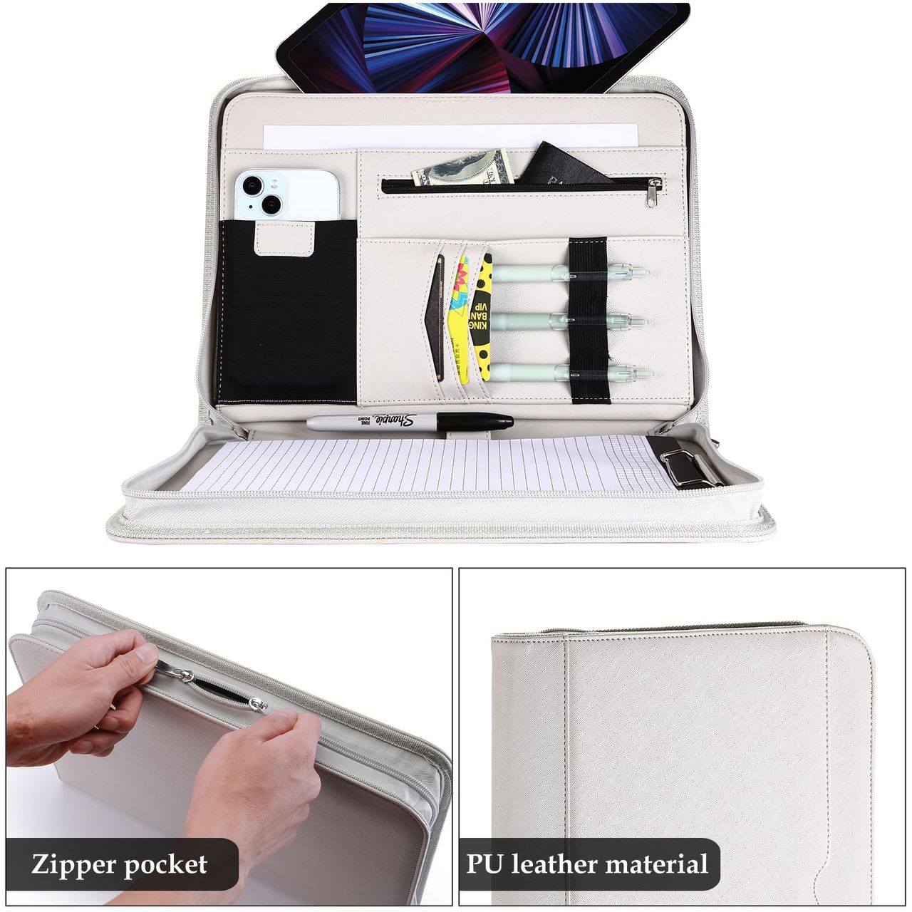 - Vários Compartimentos: [lado Esquerdo] Porta-cartões De Visita, Porta-lápis, Um Bolso, Uma Capa Para Tablet De 12,9 Polegadas, Bolsa Elástica Para Celular, Pasta De Arquivos E Bolso Com Zíper, [meio] Um Porta-lápis, [lado Direito] Uma Prancheta E Um Bloco De Notas De 20 Páginas, [externo] Bolso Extra