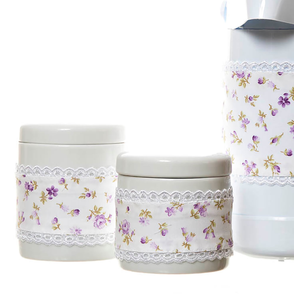 Kit Higiene Com Garrafa Térmica E Porcelanas Brancas Decoradas Com Capas Em Tecido.