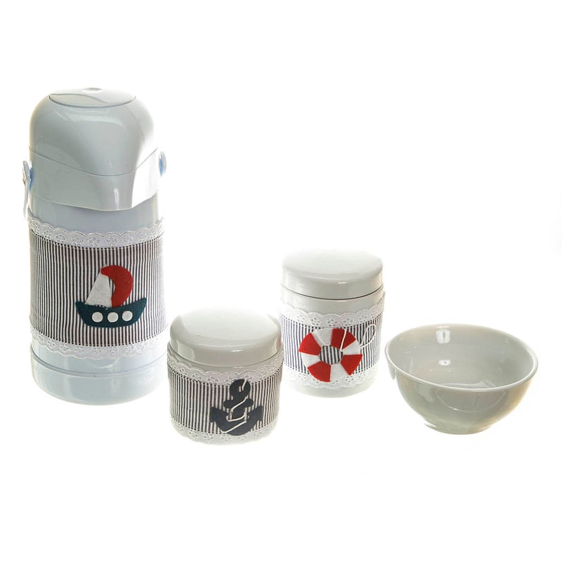 Para deixar seu bebê sempre cheirosinho este kit é perfeito Fabricados com materiais de altíssima qualidade e resistência, esse kit foi desenvolvido para facilitar o dia a dia das mamães, que precisam da praticidade de ter tudo devidamente armazenado e pronto para uso..¿ Dados Técnicos.Kit higiene com garrafa térmica e porcelanas brancas decoradas com tecido e detalhes náuticos de feltro...¿ Itens Inclusos no Kit.01 Garrafa Térmica Marca Termolar modelo Magic Pump 500 ml.01 Pote grande em porcelana branca com tampa.01 Pote pequeno em porcelana branca com tampa .01 Molhadeira em porcelana branca.01 Conjunto de 3 capas em tecido e velcro para garrafa térmica, pote grande e pote pequeno..¿ Medidas.Garrafa Térmica: 11 cm de diâmetro e 25 cm de altura.Pote Grande: 9 cm de diâmetro e 10 cm de altura.Pote Pequeno: 9 cm de diâmetro e 8,5 cm de altura.Molhadeira: 11,5 cm de diâmetro e 5,5 cm de altura
