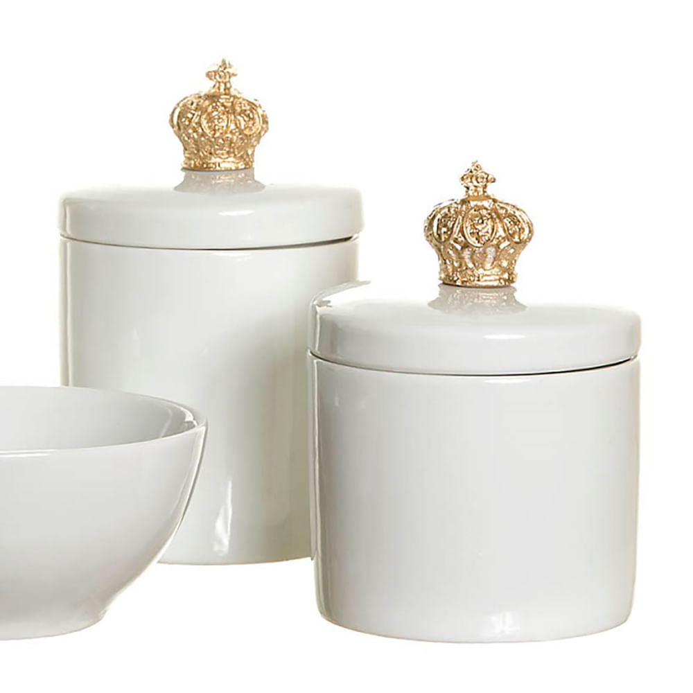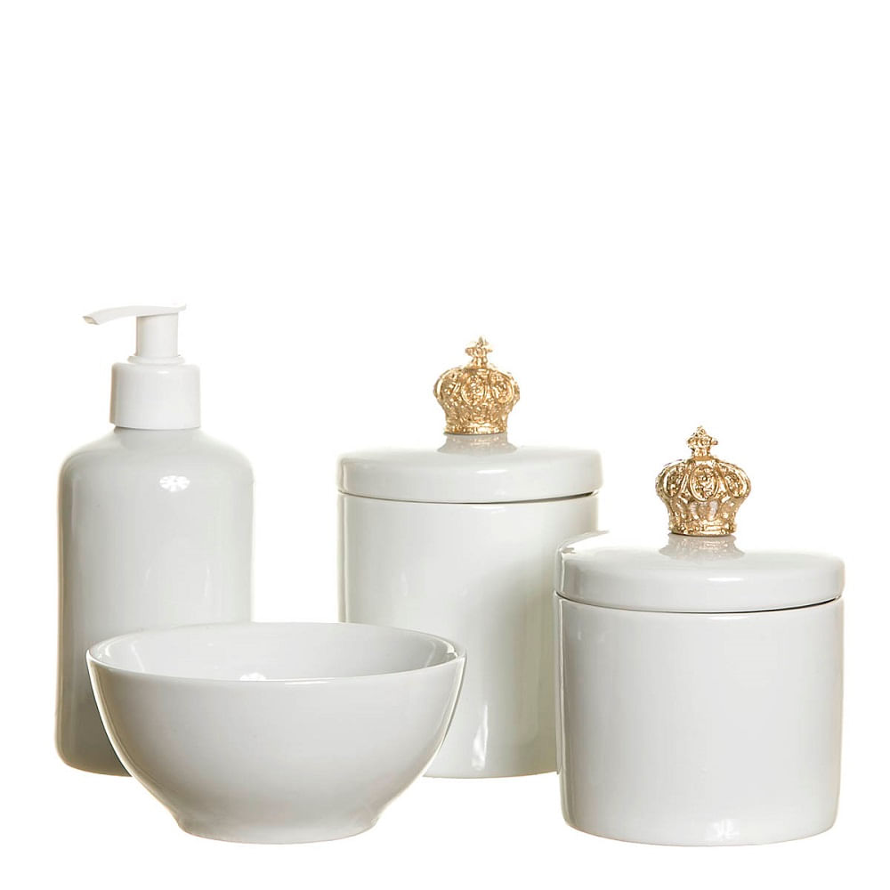 kit Higiene Com Porcelanas Brancas Decoradas Com Coroas Douradas.