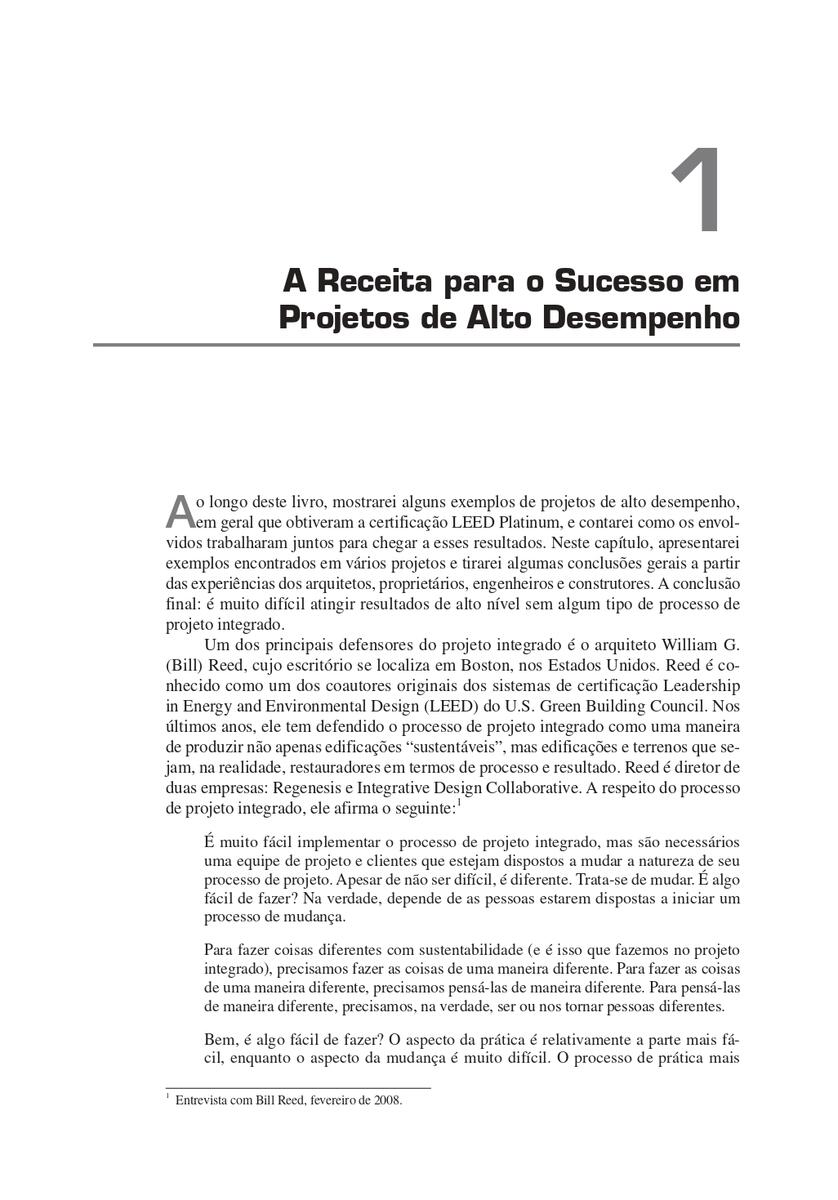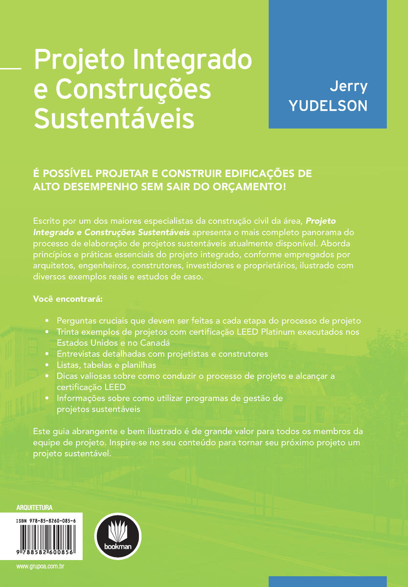 Escrito por um dos principais nomes na area, este livro mostra passo a passo o processo de planejamento, projeto, construcao e operacao de edificacoes sustentaveis de alto desempenho, utilizando metodos comprovados de projetos integrados. Com perfis detalhados de projetos, entrevistas, listas de conferencia, tabelas e planilhas, oferece um panorama da construcao sustentavel para todos os profissionais envolvidos no processo. Inclui informacoes cruciais sobre os fatores-chave de sucesso, como entregar um projeto no prazo e dentro do orcamento, dicas valiosas sobre como conduzir o processo de projeto e certificacao LEED e muito mais.