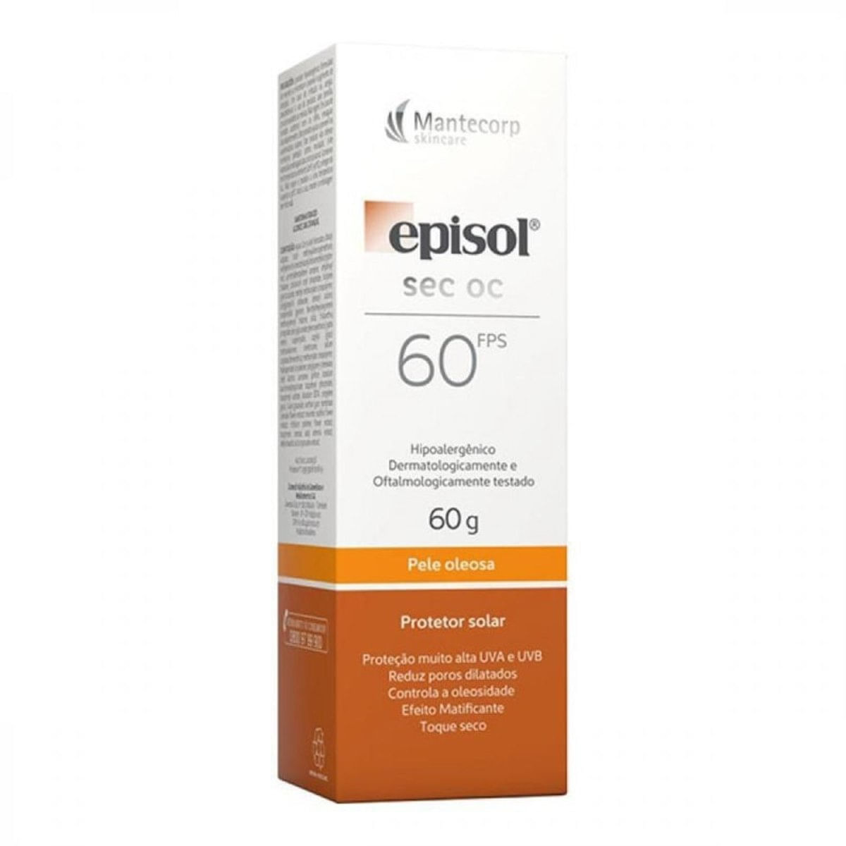 Protetor Solar Episol Sec Oc Fps 60G.Pele oleosa...Oil control..Toque seco..Hipoalergênico..Efeito matificante..Controla a oleosidade..Reduz poros dilatados..Oftalmologicamente testado...Episol Sec Oc Fps 60 é ideal para pele oleosa devido a tecnologia Oil Control que proporciona toque seco com efeito matificante (antibrilho), controle da oleosidade e a redução da aparência de poros dilatados. Possui uma textura leve com rápida absorção. Protege a pele imediatamente após sua aplicação. Oferece proteção muito alta contra os raios Uva e Uvb. O uso regular auxilia na prevenção do câncer de pele e dos outros efeitos danosos causados pelo sol, como o envelhecimento precoce. Preserva o colágeno através de uma tecnologia inovadora que minimiza os danos mais profundos na pele causados pelos raios infravermelhos, devido à ação antioxidante do produto. É uma loção não comedogênica (não provoca cravos). Desenvolvida para pele extremamente sensível à água e suor. Isento de corantes...Modo de usar:.O produto deve ser aplicado na fase, em abundância e uniformemente sobre a pele antes da exposição ao sol. É necessária a reaplicação do produto para manter sua efetividade. Reaplicar sempre, após sudorese intensa, nadar ou banhar-se, secar-se com toalha e durante a exposição ao sol. Para crianças menores de 6 meses, consulte um médico...Embalagem com 60G