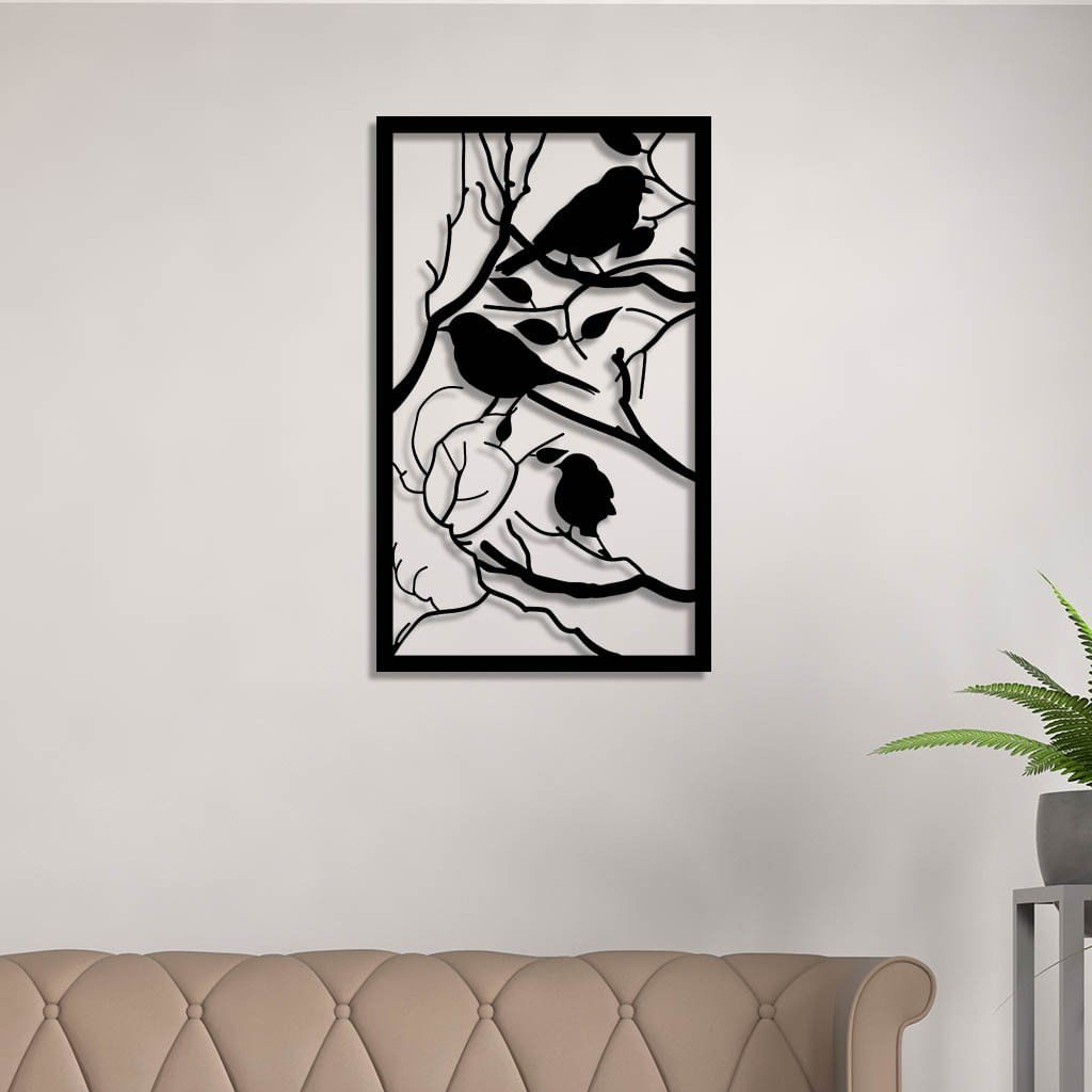 Quadro Individual Vazado Em Mdf Pássaros No Galho Preto - 24cm X 40cm -