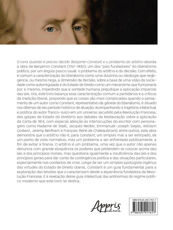 O Livro Quando É Preciso Decidir: Benjamin Constant E O Problema Do Arbítrio Aborda A Obra De Benjamin Constant (1767-1830), Um Dos “pais Fundadores” Do Liberalismo Político, Por Um Ângulo Pouco Usual: O Problema Do Arbítrio E Da Decisão. Com Efeito, É Comum A Caracterização Do Liberalismo Como Uma Doutrina Ou Ideologia Que Negligencia, Ou Mesmo Nega, A Dimensão Da Decisão, Sobre A Base De Uma Visão Da Sociedade Como Autorregulada E Do Estado De Direito Como Um Mecanismo Que Funcionaria Por Si Mesmo, Impedindo Que A Vontade Humana Prejudique A Aplicação Imparcial Das Leis. Ora, Este Livro Balança Essa Caracterização Comum A Partidários E A Críticos Da Tradição Liberal, Propondo Que As Coisas São Mais Complicadas Quando O Pensamento De Um Autor Como Constant, Representativo Da Gênese Do Liberalismo, É Situado Nos Dilemas De Seu Período Histórico De Atuação. Acompanhando A Trajetória Intelectual E Política Do Autor Franco-suíço Em Um Universo Sacudido Pela Revolução Francesa, Dos Golpes De Estado Do Diretório Aos Debates Da Restauração Sobre A Aplicação Da Carta De 1814, Com Especial Atenção Às Interlocuções Do Escritor Com Personagens Como Madame De Staël, Jacques Necker, Emmanuel-joseph Sieyès, William Godwin, Jeremy Bentham E François-rené De Chateaubriand, Entre Outros, Esta Obra Demonstra Que O Arbítrio Não É, Para Constant, Um Simples Mal A Ser Extirpado, De Um Ponto De Vista Normativo, Mas Um Problema A Ser Enfrentado Politicamente, A Fim De Evitar A Tirania. O Arbítrio É Um Problema, Uma Vez Que O Autor Não Apenas Denuncia Com Grande Eloquência Os Poderes Que Pretendem Se Colocar Acima Das Leis E Dos Princípios Morais, Mas Questiona Igualmente A Insuficiência Das Leis E Dos Princípios Gerais Para Dar Conta Da Contingência Política E Das Situações Particulares, Especialmente Nos Contextos De Crise. Longe De Ser Um Simples Apologista Ingênuo Das Virtudes Do Estado De Direito Liberal, Constant É Um Guia Fundamental Para A Exploração Das Tensões Que O Caracterizam Desde A Experiência Fundadora Da Revolução Francesa. É À Revelação Desse Guia Intelectual Das Antinomias Do Regime Político Moderno Que Este Livro Se Dedica.
