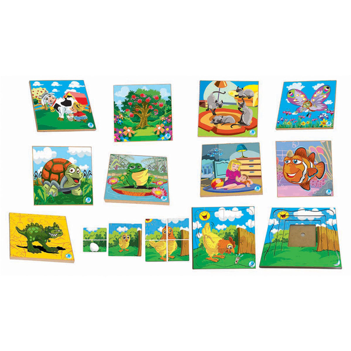 Este jogo tem como tema a origem e crescimento dos seres vivos. As peças deste quebra-cabeça são superpostas e, na medida em que vão sendo retiradas, permitem a visão do estágio anterior do servivo em questão. Contêm: 10 quebra-cabeças Material: MDF - 10 placas - 200x200x16 mm (cada) Embalagem: Caixa de Papelão - 415x217x95 Faixa etária: A partir de 03 anos