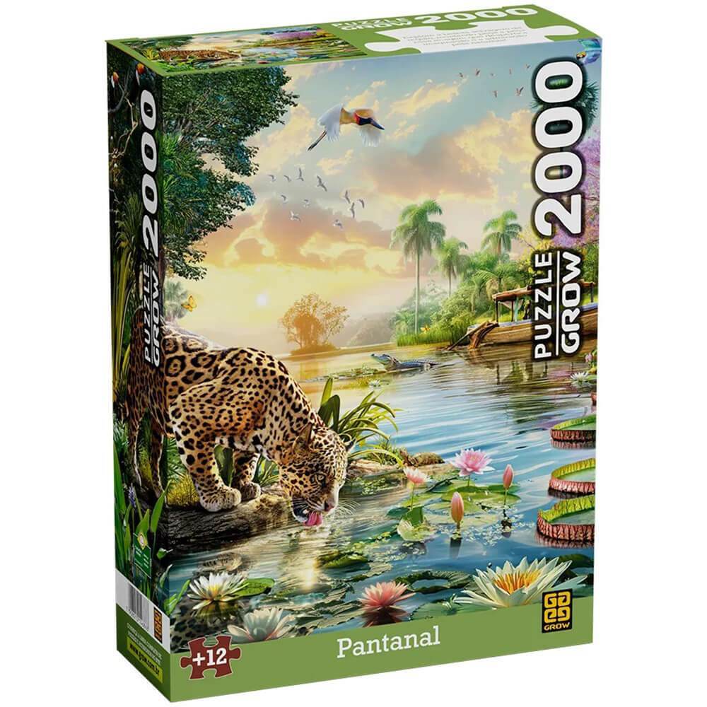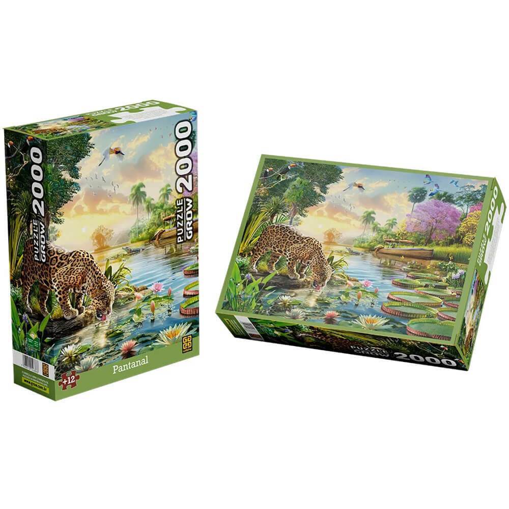 O Quebra-cabeça Torre De Babel, Da Grow, É Uma Verdadeira Obra De Arte Para Quem Ama Desafios. Com 1998 Peças, Ele É Indicado Para Maiores De 12 Anos E, Montado, Mede Aproximadamente 70,4 X 97,8 Cm. A Imagem Traz Uma Cena Deslumbrante: Uma Onça-pintada Bebendo Água Em Um Rio Cercado Por Vitórias-régias E Flores De Lótus, Enquanto Ao Fundo Um Barco Com Um Pescador Divide Espaço Com Um Jacaré. A Composição É Enriquecida Por Aves De Diversas Espécies Em Meio A Um Pôr Do Sol Espetacular, Criando Um Cenário Cheio De Beleza E Vida Selvagem.