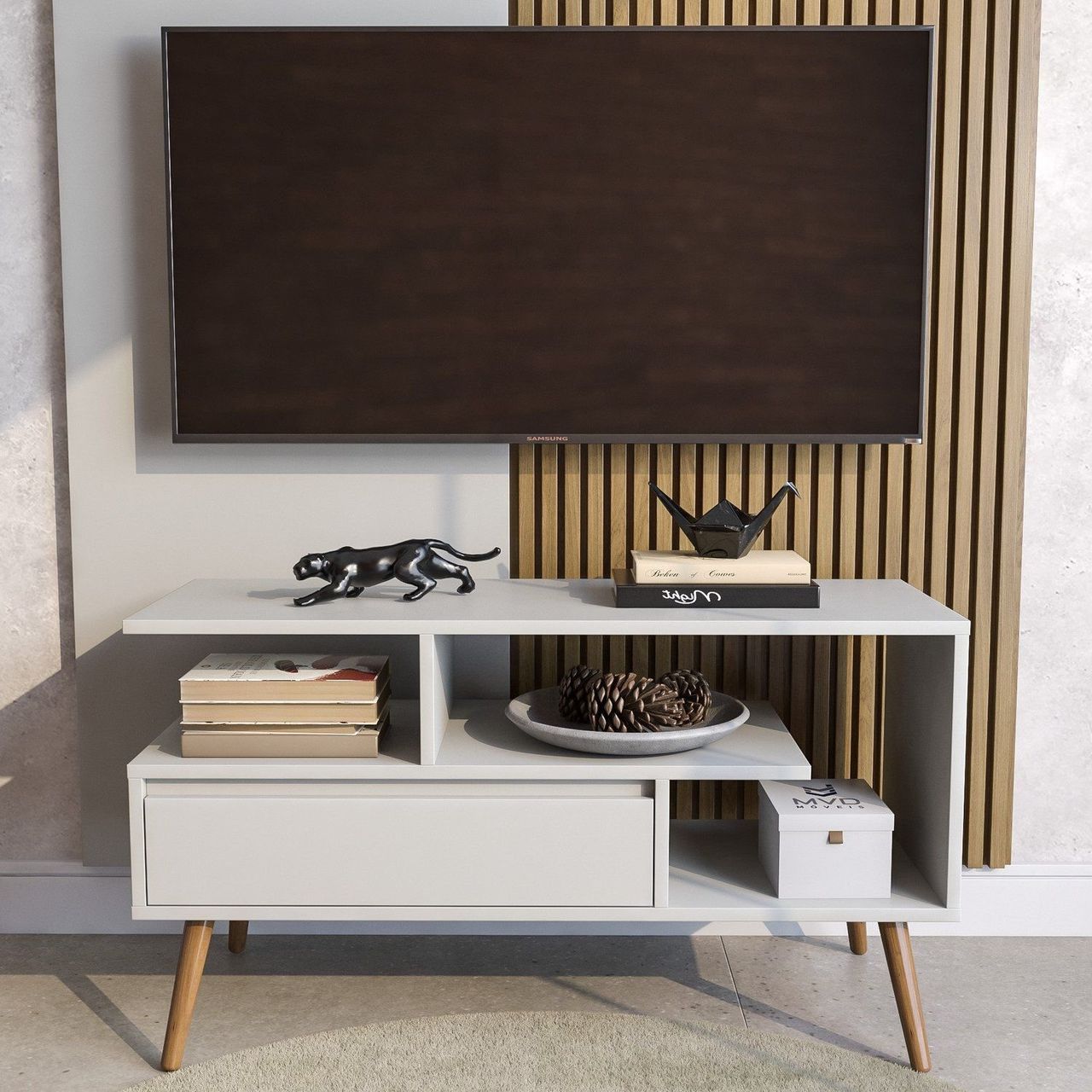 Estilo: Retrô | Peso (kg): 12 | Garantia: 03 Meses | Altura (cm): 50 | Acabamento: Bp | Largura (cm): 90 | Possui Pés: Sim | Possui Vidro: Não | Possui Nichos: 1 | Possui Portas: Sim | Altura Dos Pés: 17 | Possui Gavetas: Não | Possui Rodízio: Não | Suporta Até (kg): 60 | Possui Espelhos: Não | Profundidade (cm): 33 | Escala De Brilho: Fosco | Material Dos Pés: Madeira Maciça | Serviço Montagem: 114259443 | Fixação Na Parede: Não | Material Da Porta: Mdf/mdp | Origem Do Produto: Nacional | Possui Iluminação: Não | Acabamento Dos Pés: Verniz | Ambiente Principal: Sala De Estar | Espessura Do Tampo (mm): 15 | Material Principal: Mdf/mdp | Possui Passa Cabos: Sim | Possui Prateleiras: Sim | Acabamento Da Porta: Bp | Espessura Do Painel: 1.5 | Sapatas Niveladoras: Não | Material Da Prateleira: Mdf/mdp | Acabamento Da Prateleira: Bp | Painel Para Tv Integrado: Não | Tipo De Puxador Da Porta: Não Possui | Escala De Brilho Da Porta: Fosco | Peso Máximo Por Prateleira: 10 | Ideal Para Tvs Até (polegadas): 55 | Escala De Brilho Da Prateleira: Fosco | Tipo De Madeira Maciça Dos Pés: Pinus | Suporte De Tv Universal Incluso: Sim | Fabricante: Mvd | Marca: Mvd | Cor Interna: Branco | Cor Do Produto: Branco | Itens Inclusos: 1 Rack, Kit Ferragens E Manual De Montagem | Cor Predominante: Branco | Quantidade De Prateleiras: 04 Prateleiras | Quantidade De Portas: 1 Porta