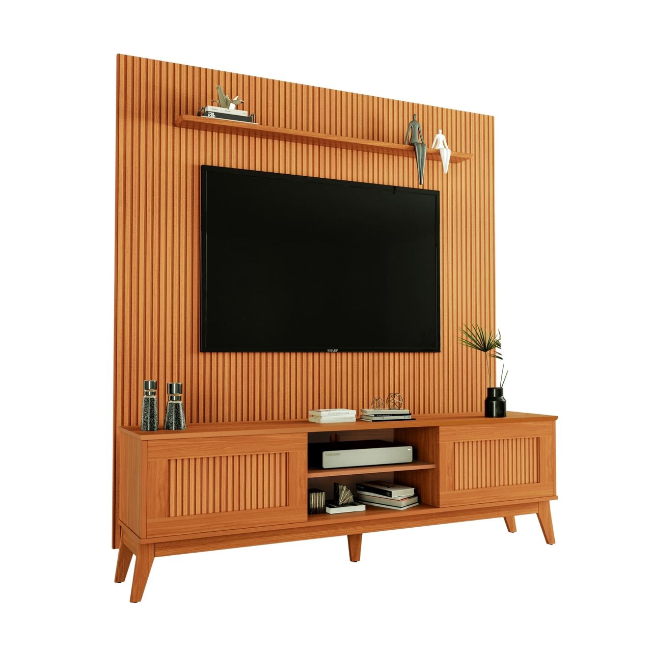 DIFERENCIAL: Tampo do Rack em MDF com borda laqueada, acabamento do painel em ripado impressão 3D, portas deslizantes com acabamento em moldura, prateleiras, trilhos em ABS, produto acomoda TV, receptores e objetos decorativos.