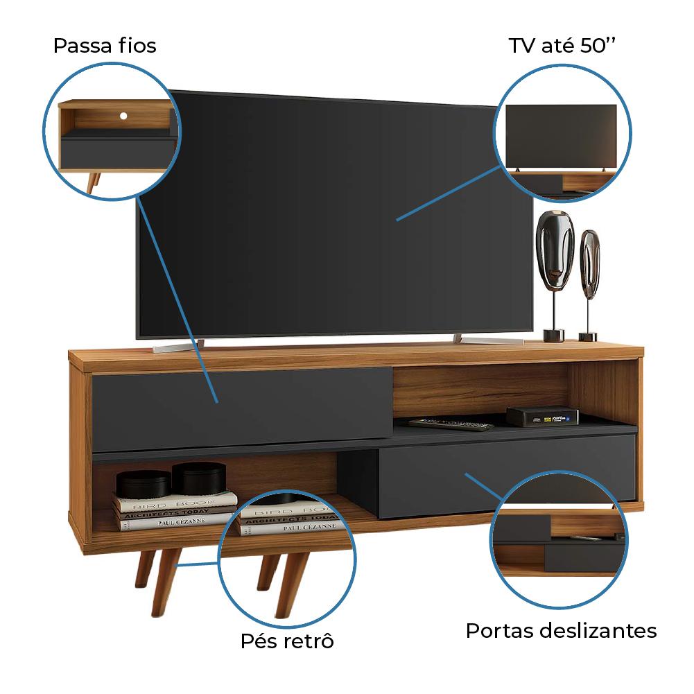 DIFERENCIAL: PÉS RETRÔ, NICHOS ESPAÇOSOS, PORTAS DESLIZANTES, ESPAÇOS PARA ELETRÔNICOS, PRODUTO COMPACTO