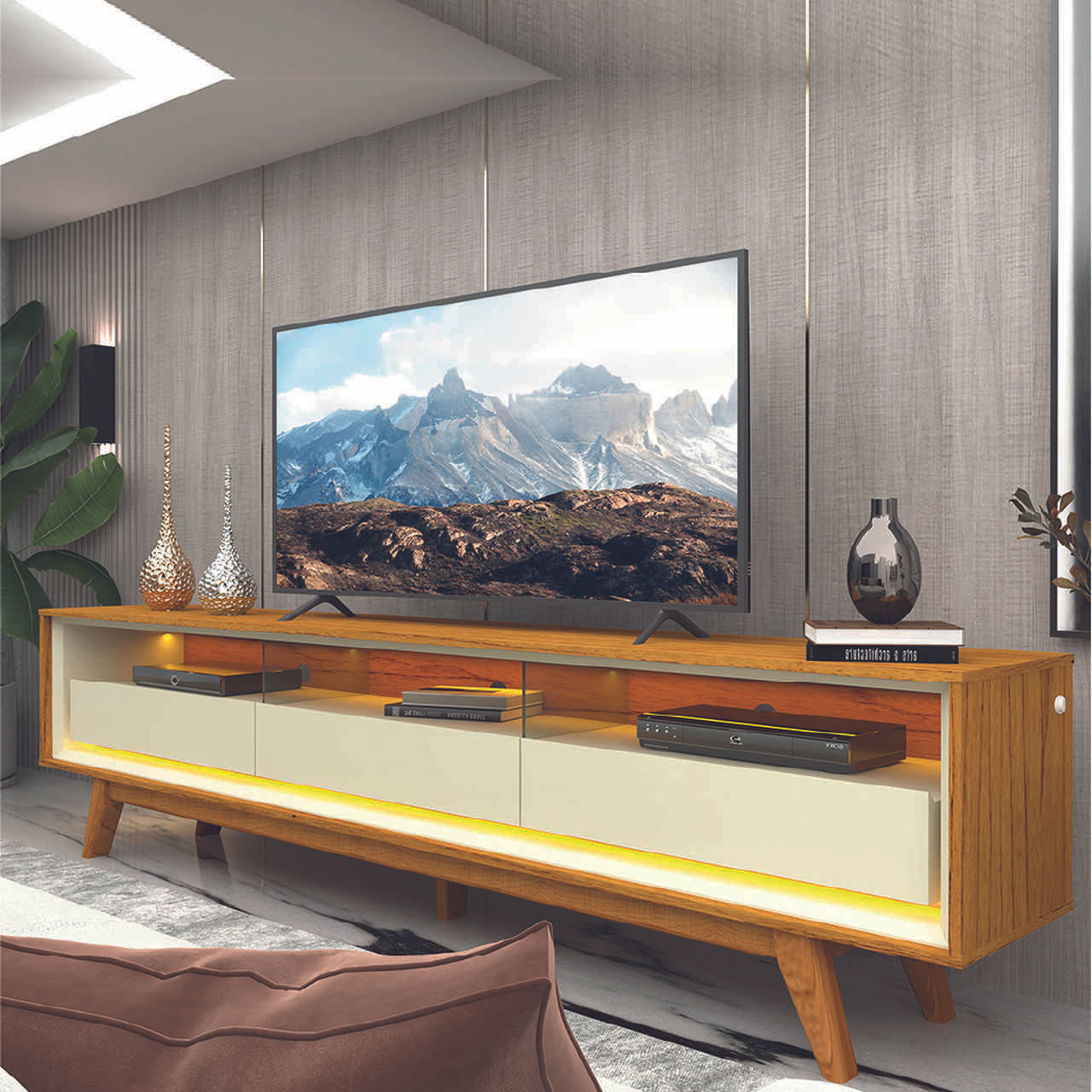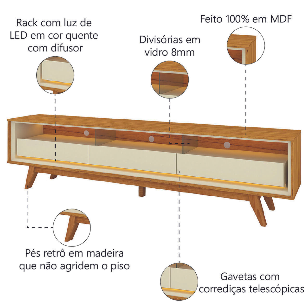 O Rack Requinte É A Verdadeira Definição De Beleza E Sofisticação. Produzido 100% Em Mdf, Ele Se Destaca Pela Iluminação Led Em Cor Quente, Que Cria Um Ambiente Acolhedor E Confortável. Conta Com Gavetas Com Corrediças Telescópicas, Garantindo Um Deslizamento Suave E Prático, Divisórias De Vidro De 8mm E Suporta Tvs De Até 90 Polegadas. Seus Pés De Madeira Em Estilo Retrô Acrescentam Um Toque Elegante Ao Seu Ambiente. Fabricado Com Materiais De Alta Qualidade, O Rack Requinte Garante Resistência E Durabilidade, Sendo A Escolha Ideal Para Quem Busca Um Toque De Estilo E Funcionalidade!medidas:a = 58 Cml = 212 Cmp = 39,8 Cmgavetas Suportam Até: 5 Kgprateleiras Suportam Até: 6 Kgproduto Suporta Até: 70 Kgpeso: 53 Kgaltura Dos Pés: 20 Cmideal Para Tv De Até: 90 Polegadasmodelo: Rack Bancada Para Tv Até 90 Polegadas Com Led Requintecor: Naturale/off Whitemarca: Geliusacabamento: Pintura Uvmaterial Da Estrutura: Mdfgavetas: 3prateleiras: 3pés: 5material Dos Pés: Madeiracorrediças: Telescópicasdiferencial: Divisórias De Vidro, Produto 100% Mdfitens Inclusos: 1 Rack, 1 Manual De Montagem, 1 Kit Parafusosinstruções/cuidados: Para Maior Durabilidade, Recomendável Que A Limpeza Dos Móveis Seja Feita Com Pano Limpo E Levemente Umedecido Em Água E Sabão Neutro. Em Seguida, Deverá Ser Passado Um Pano Limpo E Seco.garantia: 3 Meses Pelo Fabricantea Esplanada Móveis Se Responsabiliza Pela Entrega Dos Produtos Adquiridos Até A Porta De Entrada Ou Portaria Do Endereço Indicado, Se A Portaria Do Condomínio Permitir, As Entregas São Efetuadas No Piso Térreo E É De Responsabilidade Do Cliente A Locomoção Da Mercadoria Até Seu Apartamento Ou Casa.