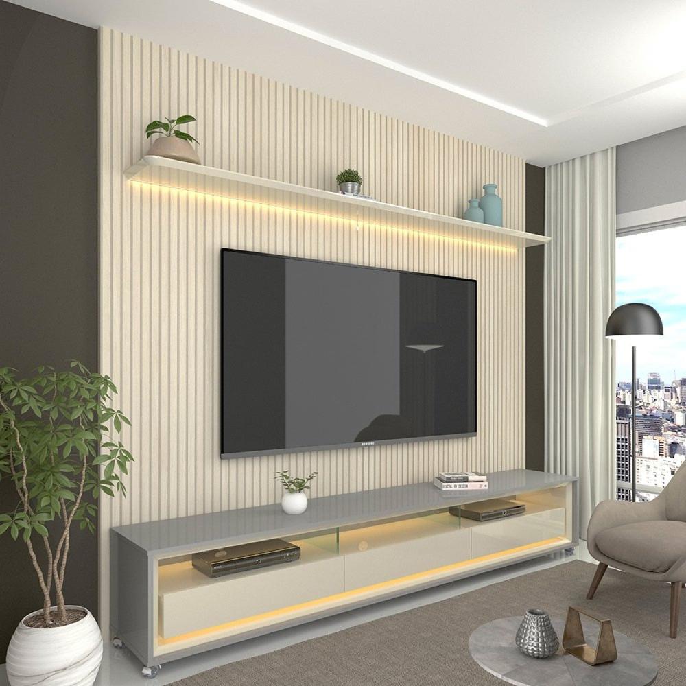 O conjunto Rack e Painel Requinte é a peça ideal para quem deseja modernidade e sofisticação em sua sala de estar, o painel conta com desenho ripado em 3d, led em luz quente com difusor, proporcionando sensação de aconchego para o seu ambiente e, prateleira decorativa chanfrada com bordas laqueadas, podendo ser colocada tanto na parte superior, quanto na parte inferior do produto. Já o Rack contém em sua composição, led em luz quente na parte inferior e superior do produto, divisórias em vidro de 8mm, gavetas chanfradas com bordas laqueadas e rodízios.