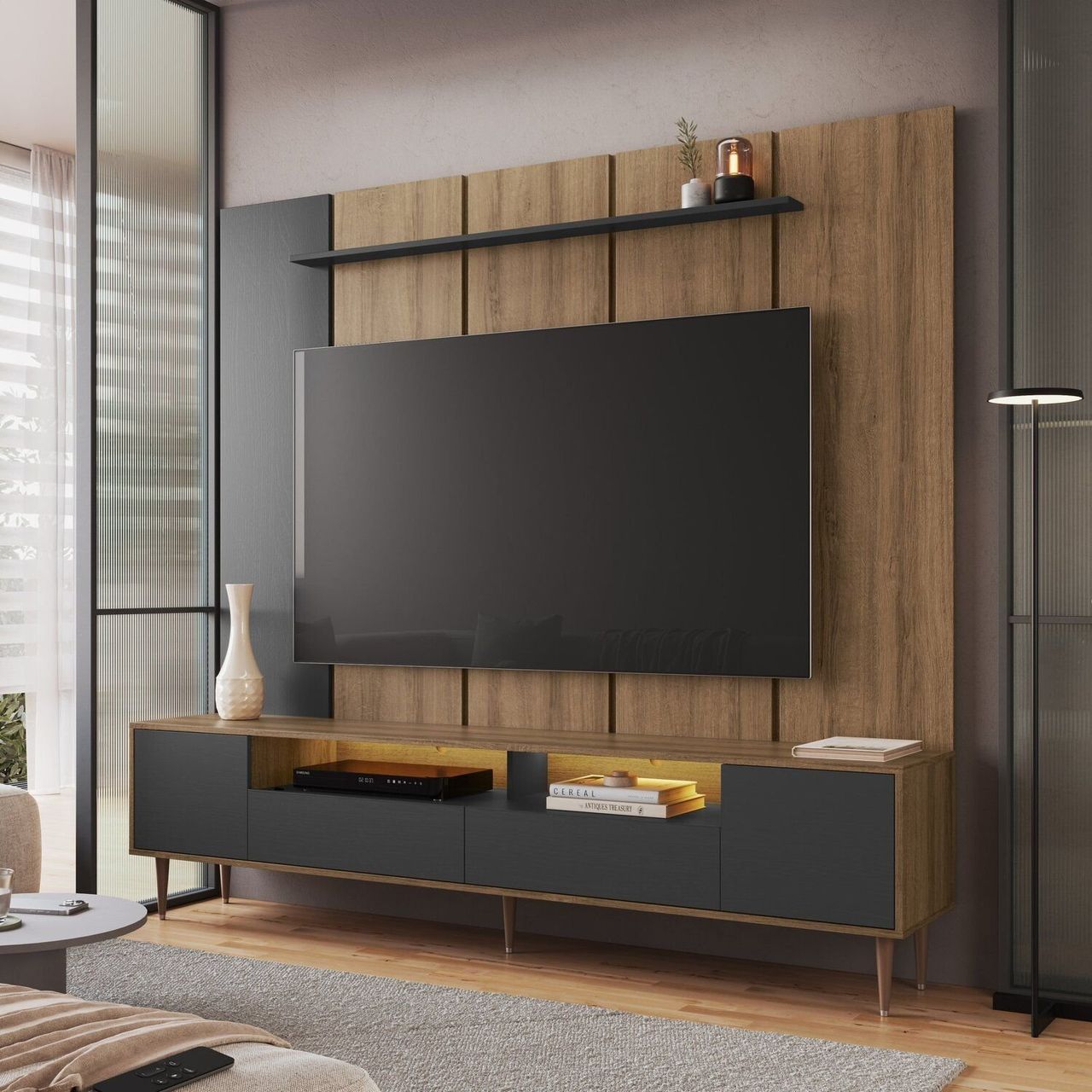 Rack Com Painel Para Tv 75 Polegadas 186,7cmx200cm Com Iluminação Led Rotterdam Grafite/mel.