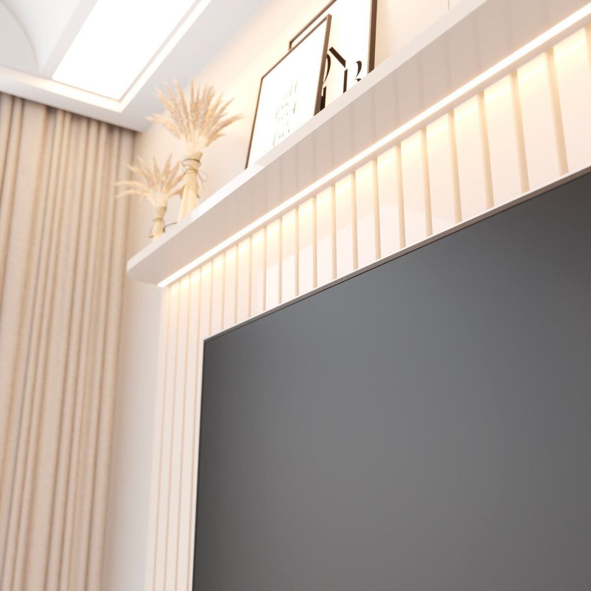 A iluminação embutida valoriza o painel e cria uma atmosfera acolhedora, destacando a TV e os objetos decorativos.