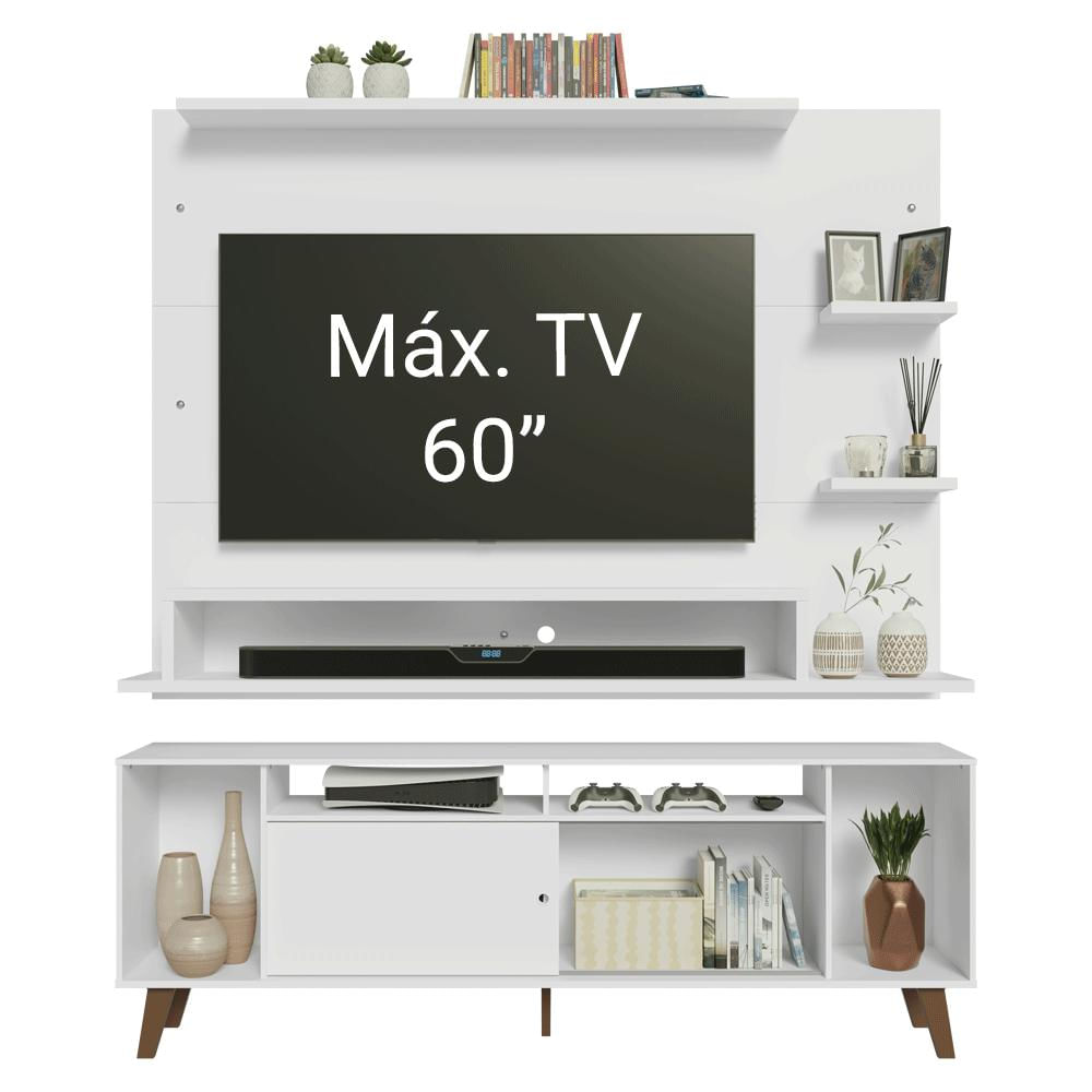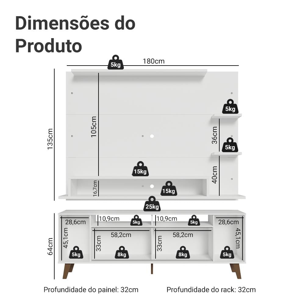 O painel para TV comporta TVs de até 60 polegadas e conta com espaço para passagem de fios e cabos, ajudando a manter tudo organizado. O rack possui nichos de tamanhos variados, com espaços que facilitam a organização. Os pés elevam o móvel, melhoram a sustentação e completam o visual com um toque moderno.