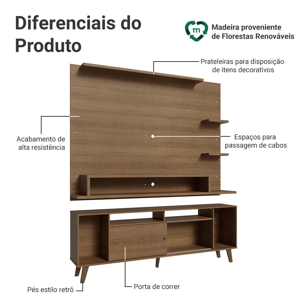 O Painel para TV comporta TVs de até 60 polegadas e conta com espaço para passagem de fios e cabos, ajudando a manter tudo organizado. O Rack possui nichos de tamanhos variados, com espaços que facilitam a organização. Os pés elevam o móvel, melhoram a sustentação e completam o visual com um toque moderno.