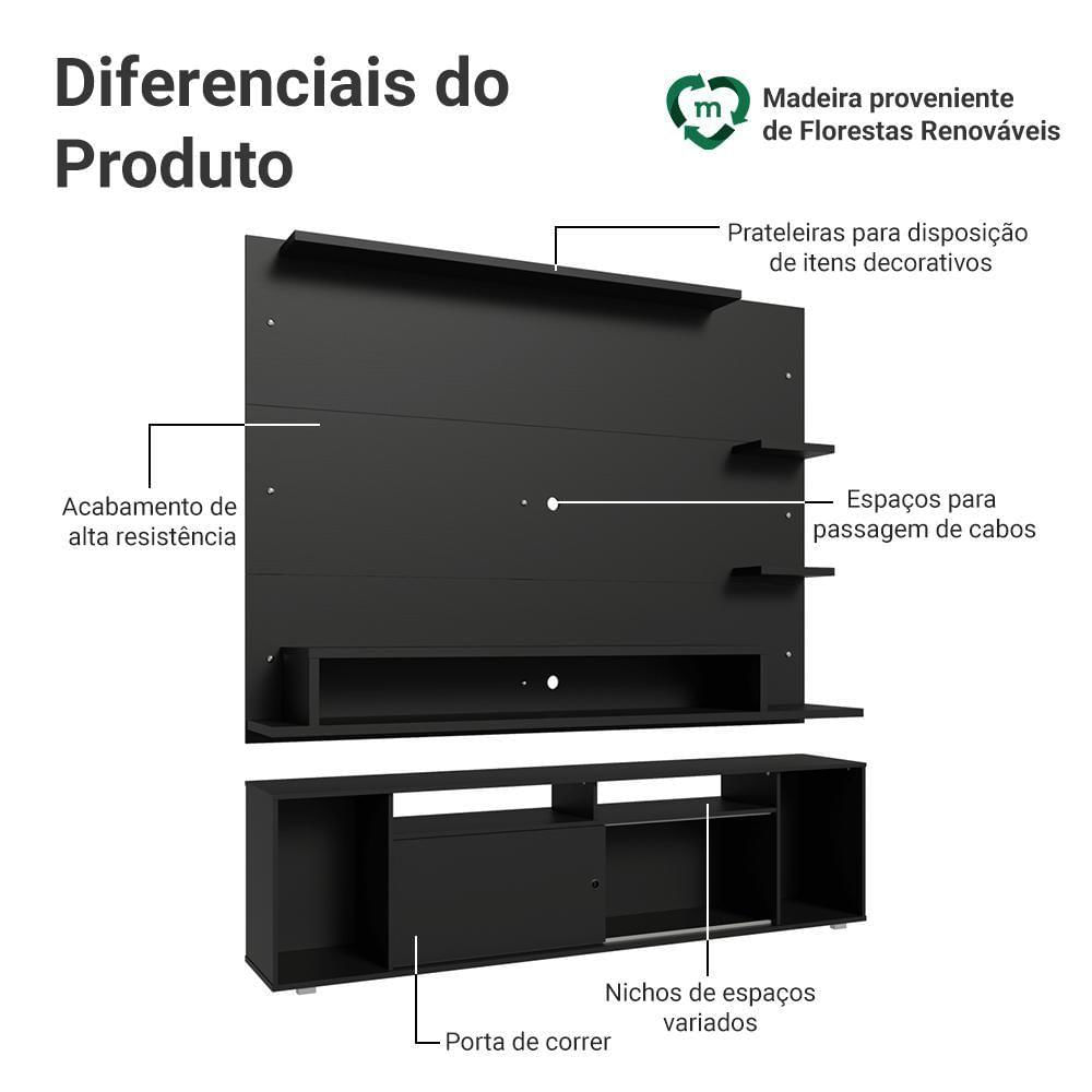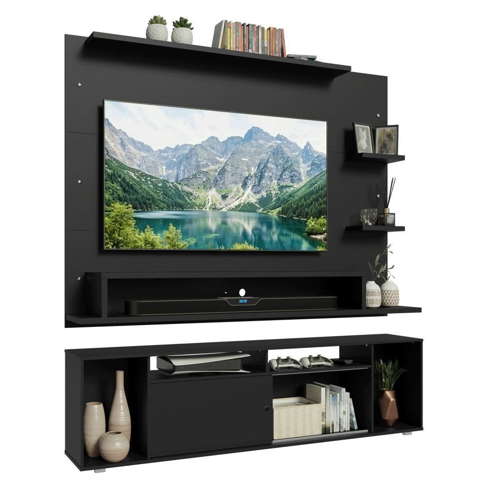 O Painel Para Tv Comporta Tvs De Até 60 Polegadas E Conta Com Espaço Para Passagem De Fios E Cabos, Ajudando A Manter Tudo Organizado E Com Visual Mais Limpo. O Rack Possui Nichos De Tamanhos Variados, Com Espaços Que Facilitam A Organização, Oferecendo Melhor Aproveitamento Do Espaço. O Acabamento Preto Confere Elegância E Personalidade Ao Conjunto, Ideal Para Ambientes Modernos.