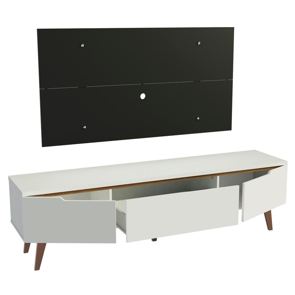 O Rack Reims da Madesa junto ao Painel para TV são a escolha perfeita para deixar a sua sala de estar organizada e de cara nova.O Rack conta com duas portas laterais e uma gaveta central com corrediças metálicas, espaços perfeitos para organizar objetos decorativos, livros, dvd ou o que mais você quiser. O destaque fica para os pés em madeira maciça em tom marrom. Além de proporcionarem melhor sustentação ao móvel, são muito bonitos e trazem um charme a mais para o ambiente.O Painel comporta TVs de até 55 polegadas. É de fácil instalação, possui passa fios e capas decorativas para esconder os parafusos de fixação. Segue com as ferragens necessárias para fixar o painel em parede de alvenaria.O acabamento do rack é branco com detalhes em amadeirado Rustic e o painel é preto. O processo é feito em Pintura Poliéster com 7 camadas de proteção, resistente a álcool, água e calor. Além de ser um processo ecológico, isento de vapores que vão para a atmosfera.Imagem meramente ilustrativa.Itens inclusos:- Um (1) Rack de 50 cm de altura x 180 cm de largura x 40 cm de profundidade- Um (1) Painel para TV de 72 cm de altura x 136 cm de largura (não acompanha suporte para fixação da TV)Obs.: A Madesa não disponibiliza serviço de montagem. O produto segue com manual de instalação e todas as ferragens necessárias para sua montagem.