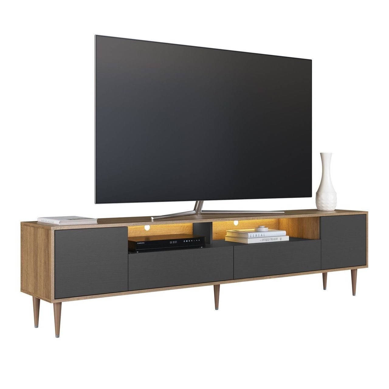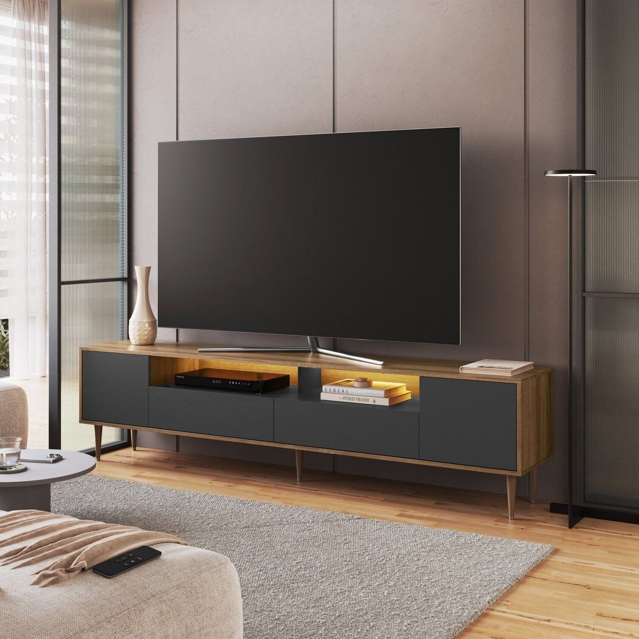 Estilo: Moderno | Peso (kg): 34.3 | Garantia: 03 Meses | Altura (cm): 50.7 | Acabamento: Finish Foil | Largura (cm): 200 | Possui Pés: Sim | Cor Da Porta: Preto | Possui Adega: Não | Possui Vidro: Não | Possui Portas: Sim | Tipo De Porta: Bater | Altura Dos Pés: 17 | Possui Gavetas: Não | Possui Rodízio: Não | Suporta Até (kg): 45 | Profundidade (cm): 36.6 | Escala De Brilho: Fosco | Material Dos Pés: Pvc | Serviço Montagem: 114259443 | Material Da Porta: Mdp | Origem Do Produto: Nacional | Possui Iluminação: Sim | Acabamento Dos Pés: Poliéster | Ambiente Principal: Sala De Estar | Espessura Do Tampo (mm): 15 | Material Da Gaveta: Mdp | Material Principal: Mdp | Possui Passa Cabos: Sim | Possui Prateleiras: Não | Acabamento Da Porta: Finish Foil | Sapatas Niveladoras: Não | Acabamento Da Gaveta: Finish Foil | Peso Máximo Por Gaveta: 5 | Quantidade De Espelhos: Não | Tipo De Puxador Da Porta: Embutido | Escala De Brilho Da Porta: Fosco | Tipo De Puxador Da Gaveta: Embutido | Escala De Brilho Da Gaveta: Fosco | Tipo De Corrediça Da Gaveta: Metálica Telescópica | Ideal Para Tvs Até (polegadas): 75 | Material Do Puxador Da Porta: Mdp | Tipo De Dobradiça/corrediça Da Porta: Metálica | Fabricante: Art In Móveis | Marca: Art In Móveis | Cor Flex: Não | Cor Interna: Mel | Cor: Grafite/mel | Cor Do Produto: Grafite/ Mel | Itens Inclusos: 1 Rack, Kit Ferragem E Manual De Montagem | Cor Predominante: Marrom | Linha Ou Coleção: Sala De Estar | Estilo Do Pé: Moderno | Modelo De Porta: Porta Lisa | Quantidade De Portas: 2 Portas | Quantidade De Gavetas: 02 Gavetas