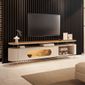Combina sofisticação e funcionalidade , sendo ideal para TVs de até 85 polegadas. Com design moderno, traz bancada com cantos arredondados, portas com vidro embutido e fecho toque, LED interno, prateleira de vidro, pés dourados e tampo em MDF 18mm com borda chanfrada. Garante qualidade e durabilidade .