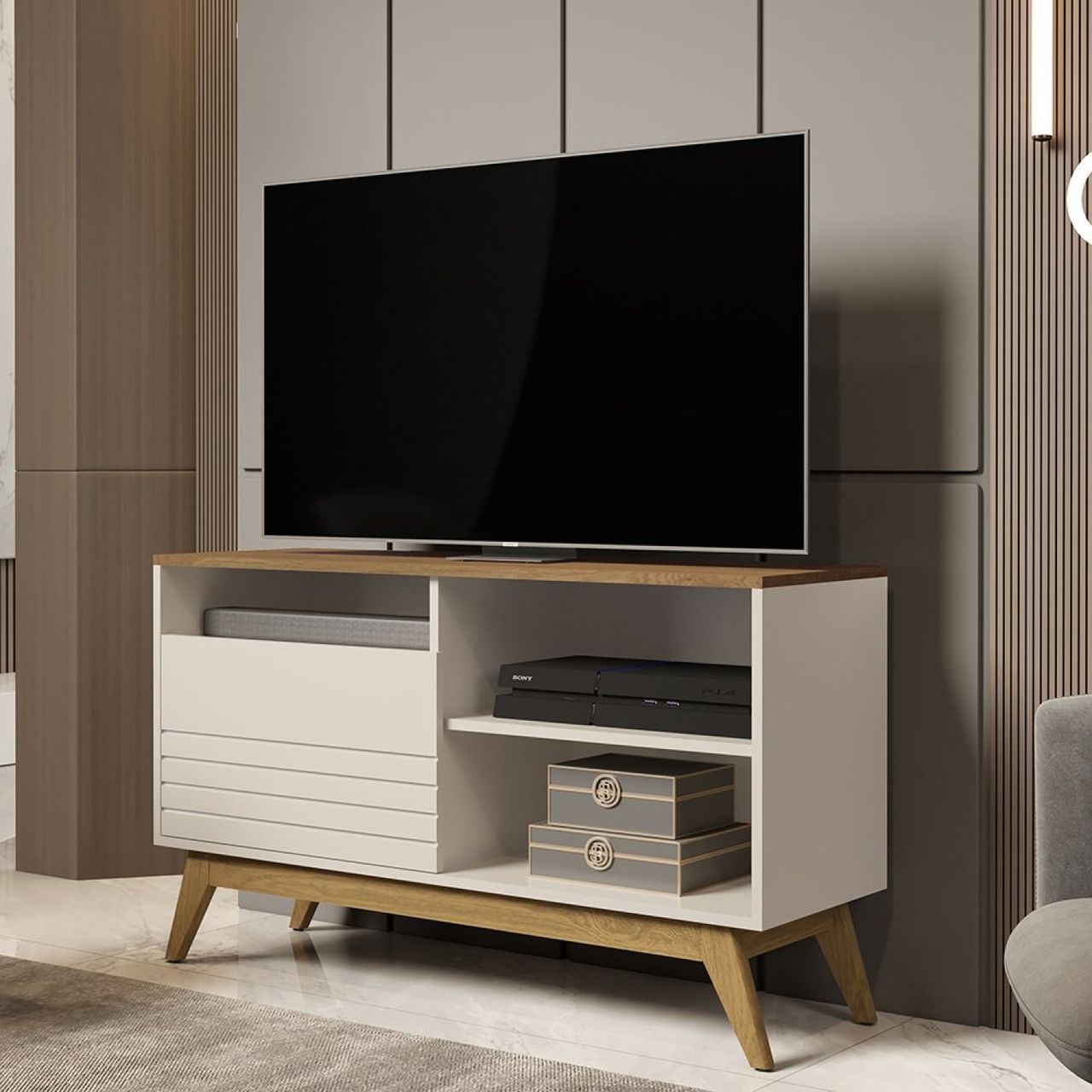 Rack Para Tv De Até 42 Polegadas Pés Em Madeira Maciça Fênix Wood Off White/freijó.
