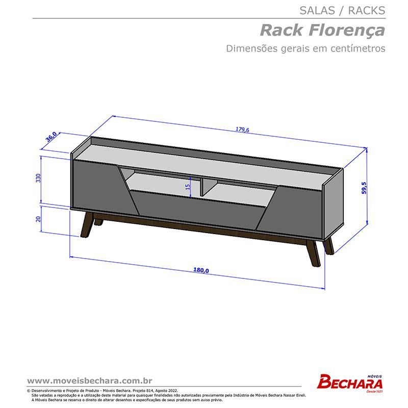 Marca: Móveis Bechara, Linha: Sala, Modelo: Rack Florença, Material Da Estrutura: Mdp De 15mm E Mdf De 15mm Com Pés De Madeira Maciça, Acabamento: Pintura Uv, Altura: 59,5 Cm, Largura: 180 Cm, Profundidade: 36 Cm, Tamanho Máximo De Tv: 70 Polegadas, Quantidade De Portas: 02, Material De Dobradiças: Metálicas Com Sistema Softclose (fechamento Macio), Quantidade De Gavetas: 01, Com Corrediças: Sim, Material Das Corrediças: Metálicas, Com Puxador: Não Se Aplica, Material Do Puxador: Não Se Aplica, Quantidade Prateleiras: 01, Com Rodízios: Não Se Aplica, Peso Suportado: 60 Kg, Requer Montagem: Sim (kit Montagem Incluso), Condição Do Item: Novo, É Kit: Não, Altura Da Embalagem: 11 Cm, Largura Da Embalagem: 38,5 Cm, Comprimento Da Embalagem: 185 Cm, Peso: 33 Kg, Embalagem Do Envio: Papelão E Plástico. Informações Adicionais: - Os Objetos Que Ambientam As Fotos Não Acompanham O Produto, - O Produto Será Entregue Desmontado, - É De Inteira Responsabilidade Do Cliente A Montagem Do Produto E/ou Instalação, Custos De Transporte Por Escadas E/ou Elevadores, Guincho Ou Içamento, Assim Como Possíveis Irregularidades Provenientes De Manuseio Inadequado, - Embora O Produto Acompanhe O Manual De Montagem, Verifique A Complexidade Antes De Decidir Montá-lo Sozinho, Recomendamos Que Contrate Um Profissional De Sua Confiança, - Fique Atento, Nossas Cores Podem Sofrer Alterações Dependendo Do Seu Monitor, - Antes De Montar O Seu Produto, Certifique-se Que Todas As Instruções Dispostas No Manual, Bem Como Todas As Ferragens Descritas, Estejam Presentes Dentro Da Embalagem. Verifique Se Há Alguma Peça Danificada, Caso Esteja, Prestaremos A Devida Assistência Dentro Do Prazo Da Garantia.