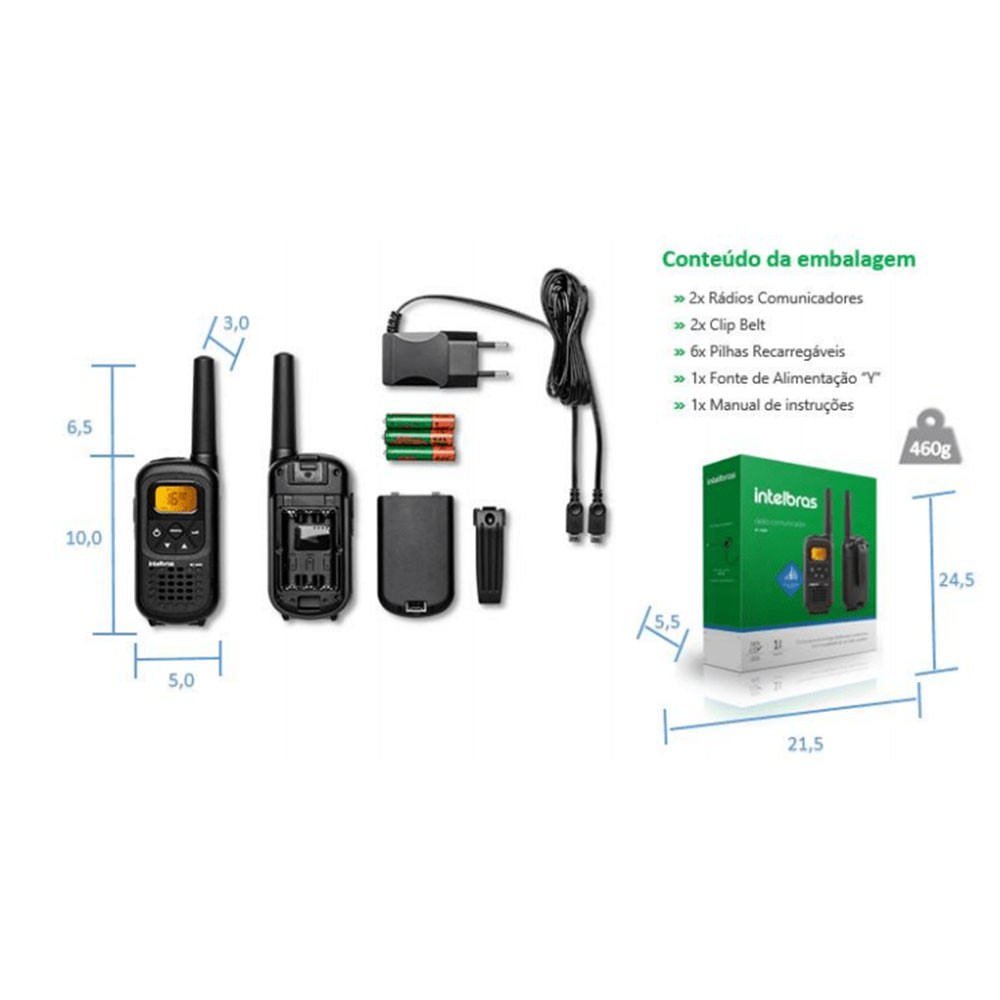 Diferenciais Competitivos: O RC 4000 junta funcionalidades para lhe proporcionar uma comunicação imediata, ágil e confiável, sem depender de sinal de operadora, instalações complicadas ou licenças. Faça a gestão da sua comunicação e veja como o produto traz praticidade para o seu dia a dia ou momentos de lazer, tudo isso com discrição e eficiência. Características Técnicas: » 26 canais + 121 subcanais » Utiliza a banda FRS/GMRS* » Compatível com pilhas recarregáveis » Até 10 horas de conversação* » Compatibilidade com carregadores portáteis » Compatível com fones de padrão P1* (Não incluso) » Função VOX* / SCAN* » Áudio alto e nítido » Alcance aproximado: Montanha e Vale -> 20KM / Lago ou Mar -> até 7KM / Área Urbana -> 1KM Descrição para e-commerce: O RC 4000 junta funcionalidades para lhe proporcionar uma comunicação imediata, ágil e confiável, sem depender de sinal de operadora, instalações complicadas ou licenças. Faça a gestão da sua comunicação e veja como o produto traz praticidade para o seu dia a dia ou momentos de lazer, tudo isso com discrição e eficiência. ESPECIFICAÇÕES TÉCNICAS DO PRODUTO Tempo de Garantia: - 1 ano Faixa de frequência - 462,5625 467,7125 Mhz Potência nominal 500 mW Quantidade de canais / subcanais 26 / 121 (38CTCSS e 83 DCS) Tempo de carga 6 horas (com as pilhas recarregáveis que acompanham o produto) Duração da bateria - 10 horas (90% Repouso / 5% Conversando / 5% Recebendo) Tipo de Bateria Pilhas recarregáveis AAA 1,2 V / NI-MH Fonte de alimentação Ent: 100-240Vac ~ 50/60Hz (automático) Saída: 5Vdc / 0,55A Peso do portátil (incluindo bateria) 130g Dimensões do portátil A 16,5 x L 5,0 x P 3,0 (cm)