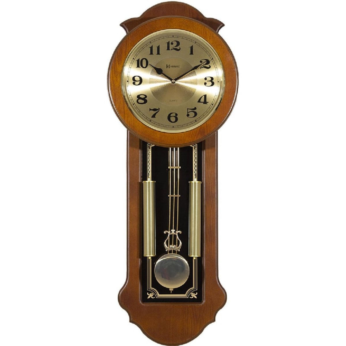 Marca: Herweg.Modelo:530007-311. .Medidas:.Diametro do vidro: 24 cm.Altura:88 cm.Espessura: 13 cm.Largura: 33 cm (Na parte mais larga). . . Funções. Relógio musical com pendulo .. Especificações. Sistema de energia: Bateria. Tipo de bateria: 3xAA, 1,5 volt (não acompanha). Visor: Acrílico. Material: Madeira. Cor do mostrador: Dourado. Cor da moldura: Marrom. . Acompanha. Nota Fiscal Eletrônica. Garantia de 1 ano do Fabricante. Embalagem Original. Manual de Instruções