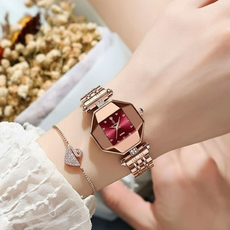 Relógio Feminino Poedagar Red Gold Etevalda: Luxo E Design Exclusivo A Prova De Água 3atm Conquiste Olhares Com O Poedagar Red Gold Etevalda, Uma Peça De Alta-relojoaria Que Redefine A Elegância Feminina, Ideal Para Quem Busca Um Acessório Que Une Precisão E Um Design Verdadeiramente Singular. Destaques: Design Geométrico Sofisticado: Sua Caixa Multifacetada E O Mostrador Em Vermelho Profundo (vinho/borgonha) Com Pontos De Diamante (zircônias De Alto Brilho) No Lugar Dos Marcadores Criam Um Visual Luxuoso E Exclusivo. Um Verdadeiro "corte De Diamante" No Seu Pulso. Acabamento Ouro Rosé Premium: A Caixa E A Pulseira De Elos Em Aço Inoxidável, Com Um Elegante Banho Ouro Rosé, Conferem Um Toque De Feminilidade E Opulência. Qualidade E Detalhes: Equipado Com Movimento De Quartzo Preciso E Uma Coroa Com Detalhe De Safira Sintética. Este Relógio Não É Apenas Um Marcador De Tempo, É Uma Joia De Pulso Pensada Para Encantar E Gerar Valor. Perfeito Para Presentear Ou Para Se Destacar Em Qualquer Ocasião, Transmitindo Uma Imagem De Bom Gosto E Alto Padrão.