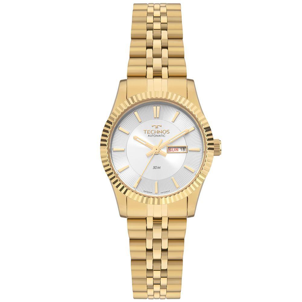 Linha Technos Automático Day-date. Apresenta novos modelos femininos que unem tradição e sofisticação em um design clássico. Com maquinismo automático japonês, Calibre 6t51, corda manual e por movimentação, reserva de marcha de 40 horas e 21 Jewels, é uma coleção que traduz a precisão relojoeira com elegância.