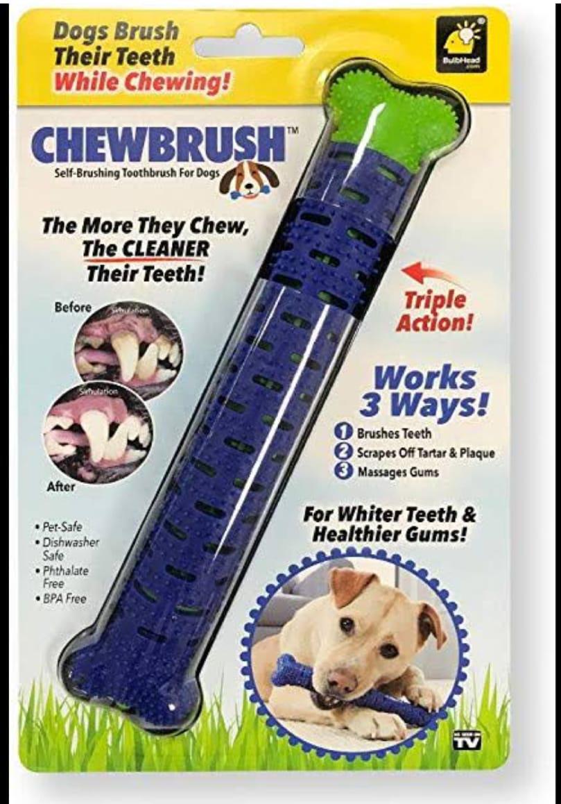 Você Ama Seu Cachorro, Mas Não O Hálito Fedido Dele. Dentistas Para Cães São Caros E Geralmente São Realizados A Cada 6 A 12 Meses. Limpar Os Dentes Com Uma Escova De Dentes E Creme Dental Para Cães Pode Ser Estressante Para Você E Seu Animal De Estimação. É Por Isso Que Seu Cão Precisa Do Chewbrush (tm), A Escova De Dentes Auto-escovável Para Cães. Não Se Preocupe - É Livre De Estresse! Chewbrush (tm) Parece Um Osso De Brinquedo. Simplesmente Deixe Seu Cão Brincar Com O Brinquedo Da Escova De Dentes E Ele Ajuda A Limpar Os Dentes. Chewbrush (tm) Funciona De Três Maneiras. Ele Escova Os Dentes Com Cerdas Ocultas No Núcleo Interior, Depois Retira A Tarter E A Placa. Finalmente, Seus Nubs Massageiam Suas Gengivas. Depois De Usar O Chewbrush (tm), Você Notará Que Seu Cão Tem Dentes Mais Brancos E Gengivas Mais Saudáveis.