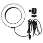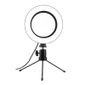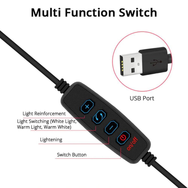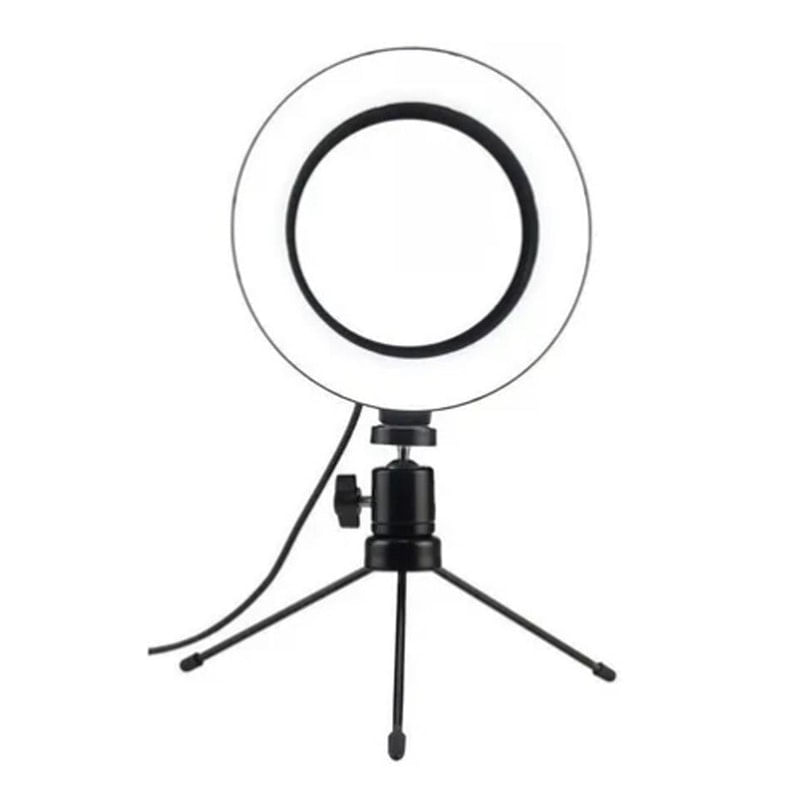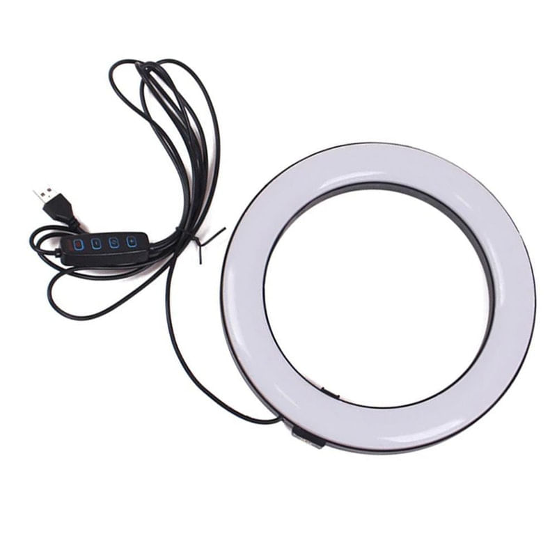 Iluminador Ring Light 6 Polegadas 16cm Usb Led 5500k Com Apoio De Mesa..Iluminador Ring Light de 16 centímetros (6,5 polegadas), desenvolvido para maquiadores, fotógrafos, cinegrafistas e etc, que buscam uma ótima maneira de iluminar com perfeição...Você pode ajustar o ângulo da iluminação por possuir um suporte articulado. É possível controlar as diferentes temperaturas de cores através do controle de ajuste que vai de 3200k à 5500k. Na frente dos leds tem um filtro difusor para suavizar a luz espalhando a luz com maior uniformidade...A alimentação do iluminador é através de cabo USB (não acompanha adaptador de tomada e não possui bateria interna recarregável), você pode utilizar um adaptador de tomada de celular para ligar ou conectar no USB do computador ou outro equipamento que forneça 5v USB. O cabo USB deverá estar sempre ligado para funcionar...É recomendado e extremamente eficaz para a macro fotografia, fotografia médica, odontológica, científica, hobby e para a iluminação/fotografia de produções de maquiadores...Fácil de usar, durável e de pouco peso, facilitando o transporte...Especificações:.Diâmetro : 16cm .Alimentação: 5v USB.Comprimento aproximado do cabo: 1,90m.Temperatura de cor: 3200k - 5500K ajustável.Ângulo Regulável: Sim.Potência: 10w