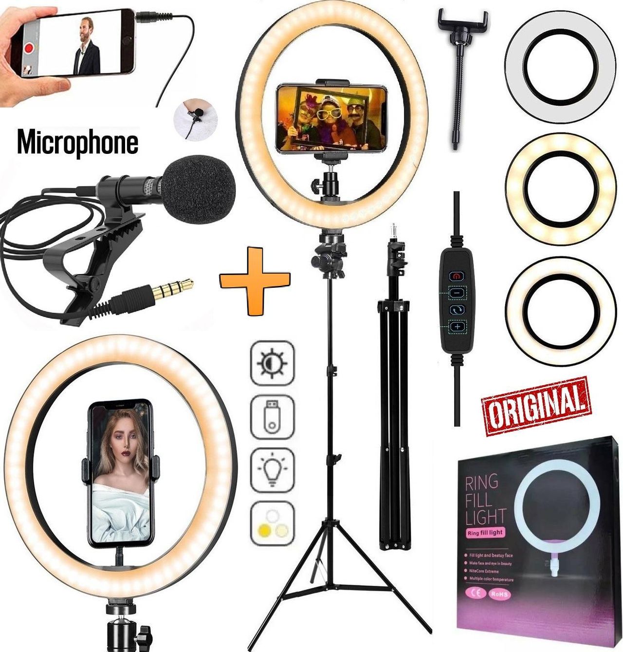 Kit Ring Light + Tripé 2,10m + Microfone Lapela + Acessórios