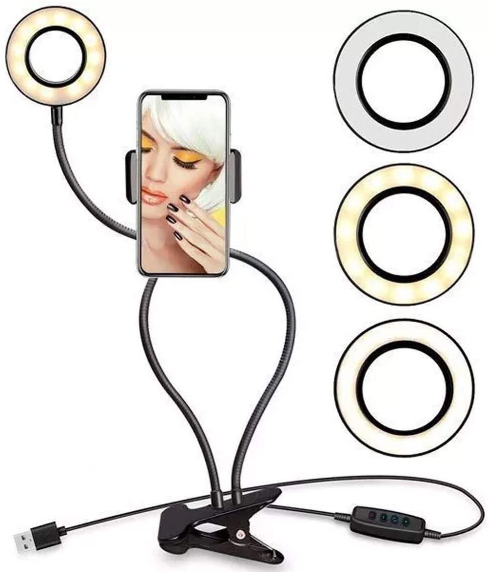 Iluminador Ring Light Suporte Live Stream Celular Com Controle Faca Videos Com Qualidade Profissional Ou Tire Otimas Fotos De Selfie Com Este Suporte Ring Light. Acessorio Perfeito Para Criar Videos Para Etc. Hastes Flexiveis Que Podem Dobrar Para Qualquer Forma, Suporte De Rotacao Do Smartphone Gira 360 Graus. Ajuste Para Qualquer Angulo Para Obter Uma Iluminacao Perfeita. Grampo Para Fixacao Em Mesas, Bancadas, Prateleiras. Possui Configuracoes De Matiz E Brilho Para Obter A Iluminacao Certa, Basta Escolher Entre 3 Modos De Luz E 9 Niveis De Brilho Para Os Seus Usos Preferidos - Maquiagem, Fotos De Selfie, Vlogging De Cenarios Escuros Etc. Controle De Facil Manuseio No Cabo Para Ligar / Desligar Ou Mudar Para O Modo De Iluminacao Que Voce Preferir. Pode Ser Usado Como Luminaria De Mesa.